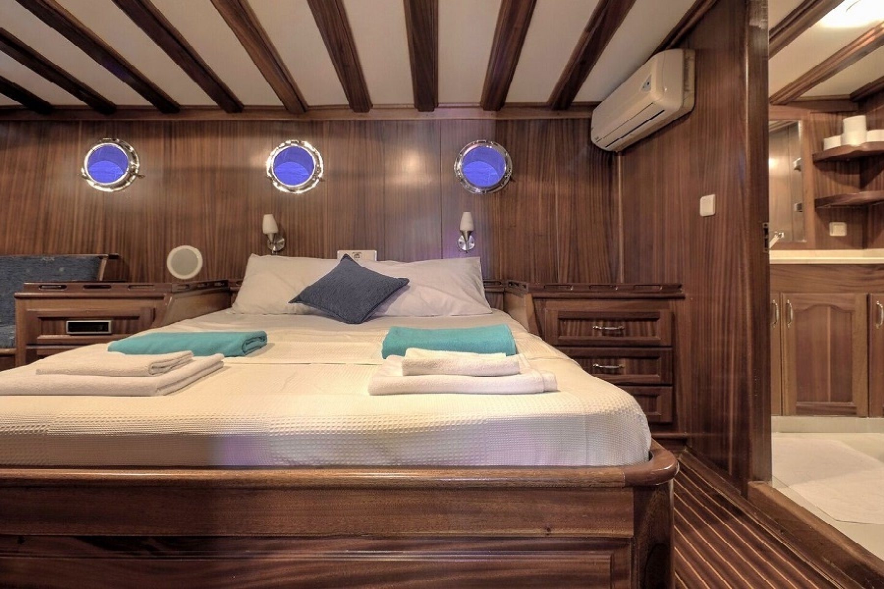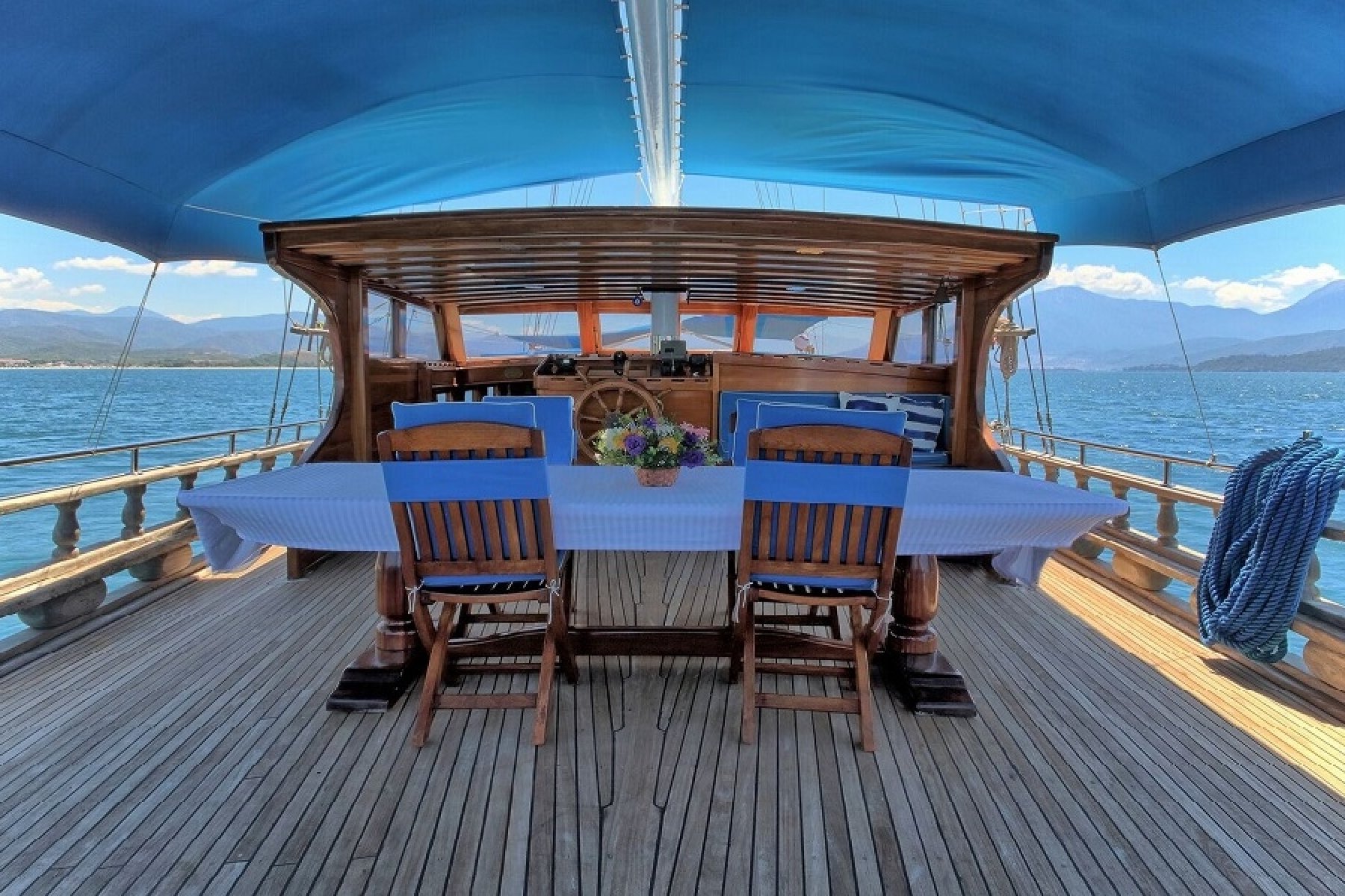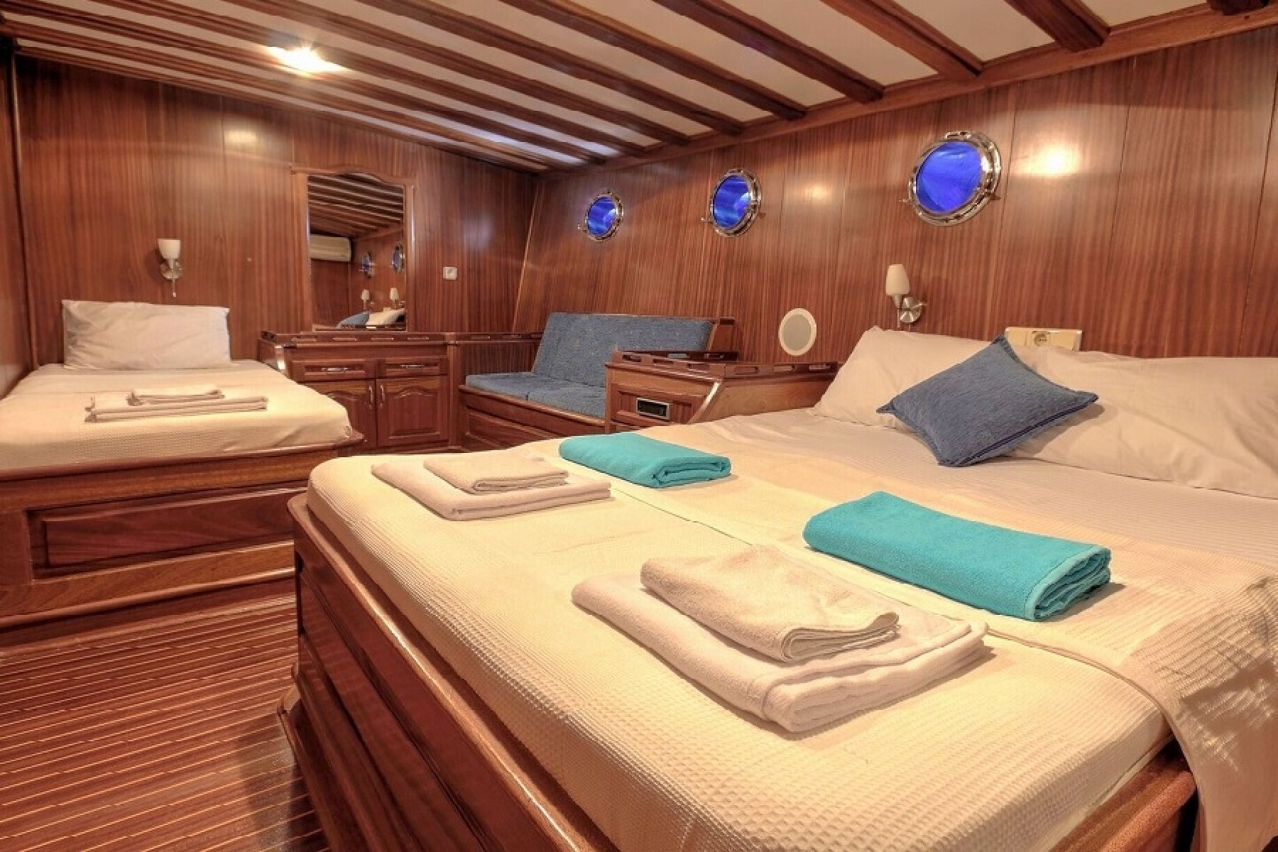5 Kamaralı 12 kişilik lüks guletimiz Fethiye çıkışlı Göcek koyları, Marmaris, Kekova rotalarında siz değerli misafirlerimize tüm yaz sezonu boyunca haftalık mavi yolculuk turları hizmeti vermektedir. teknemizde 1 kaptan 1 Aşçı ve 2 servis personelinden oluşan 4 kişilik mürettebatımız bulunmaktadır. teknemizin kamaraları oldukça geniş olup 3 kamarada çift kişilik yatak, 2 kamarada ise 1 adet çift kişilik 1 adet de tek kişilik yatak bulunmaktadır. her kabinimizde tuvalet banyo ve klima bulunmaktadır.