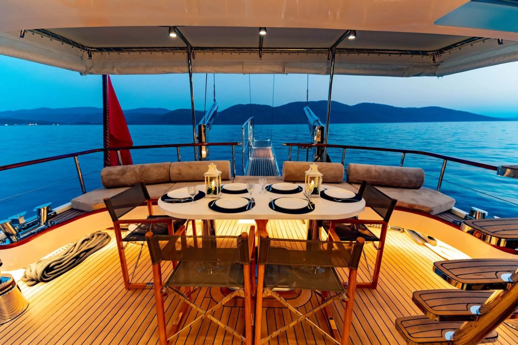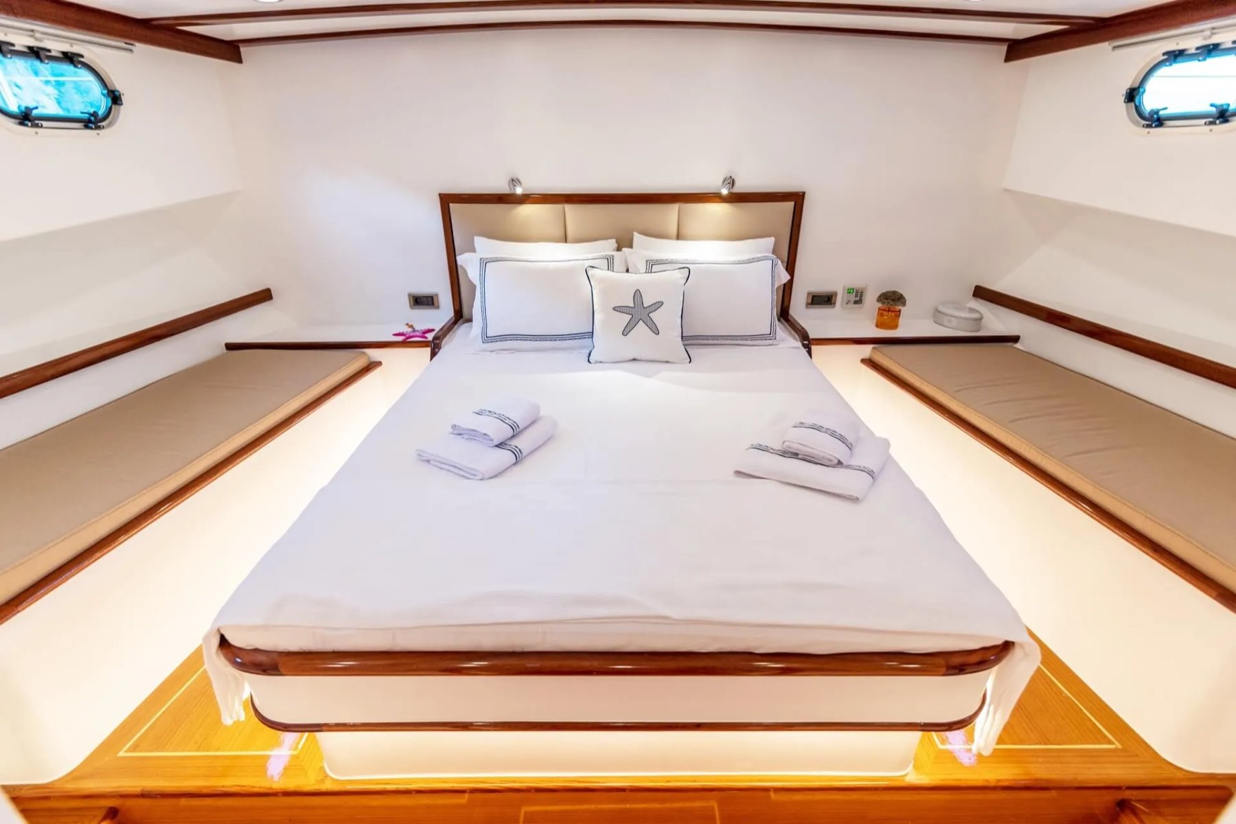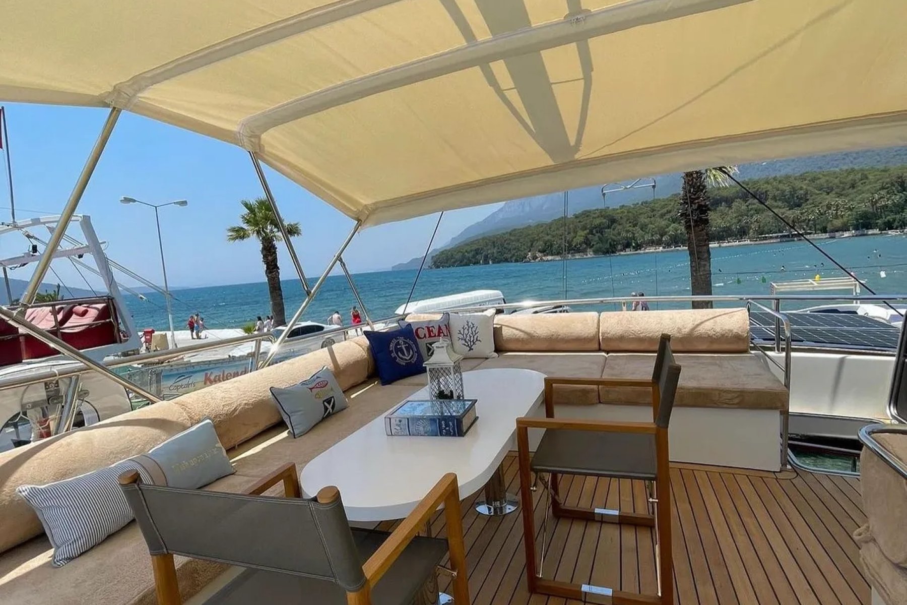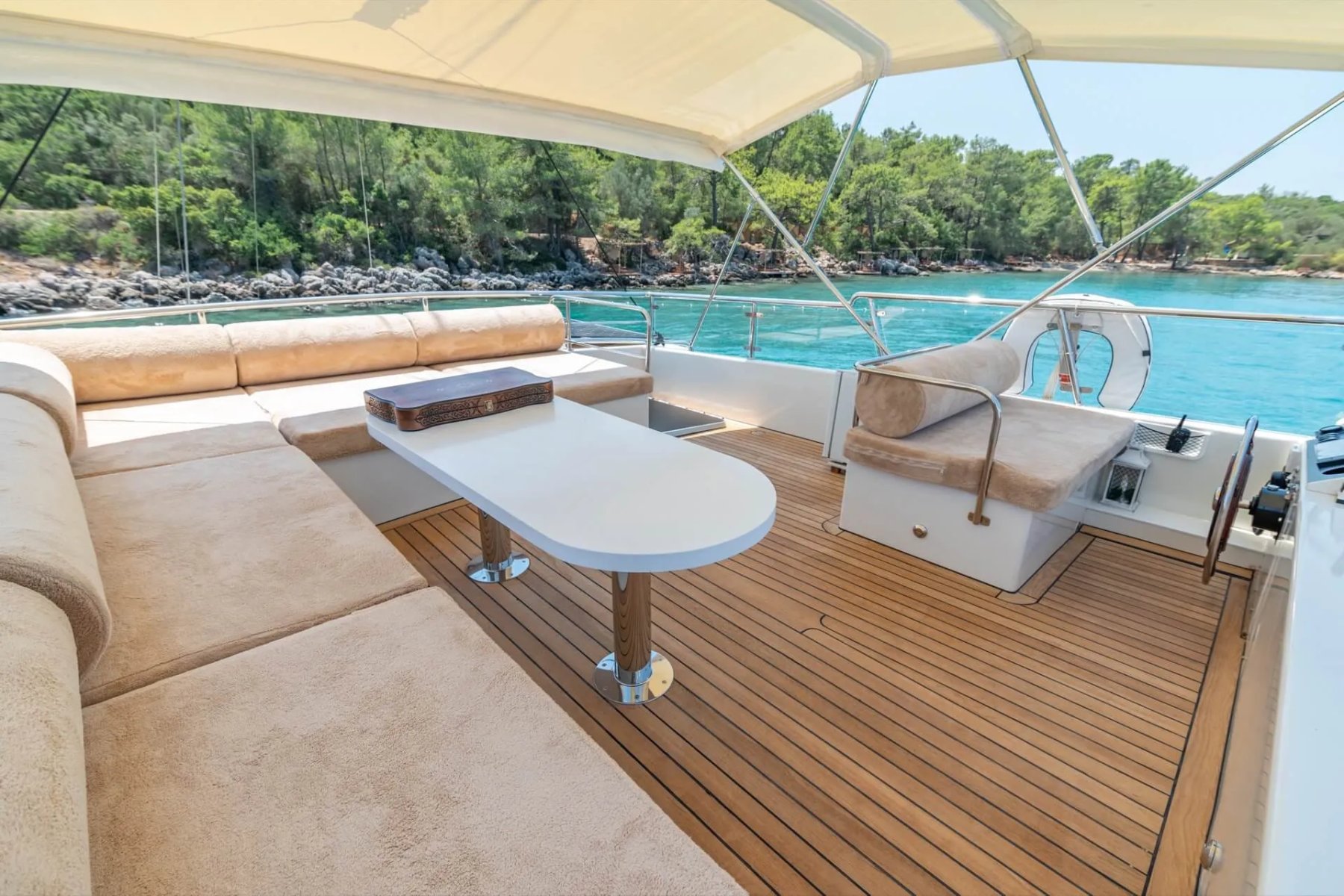 Teknemizde görevli kaptan, aşçı ve gemiciden oluşan 3 kişilik uzman ekip, tatiliniz boyunca yüksek standartlarda hizmet sunmaktadır. Geniş arka güverte, konforlu güneşlenme minderleri ve eşsiz manzaralar sunan flybridge alanı, misafirlerin gün boyu huzur bulabileceği özel noktalar olarak tasarlanmıştır. Her detay, deniz üzerinde kusursuz bir dinlenme alanı yaratmak amacıyla modernize edilmiştir.