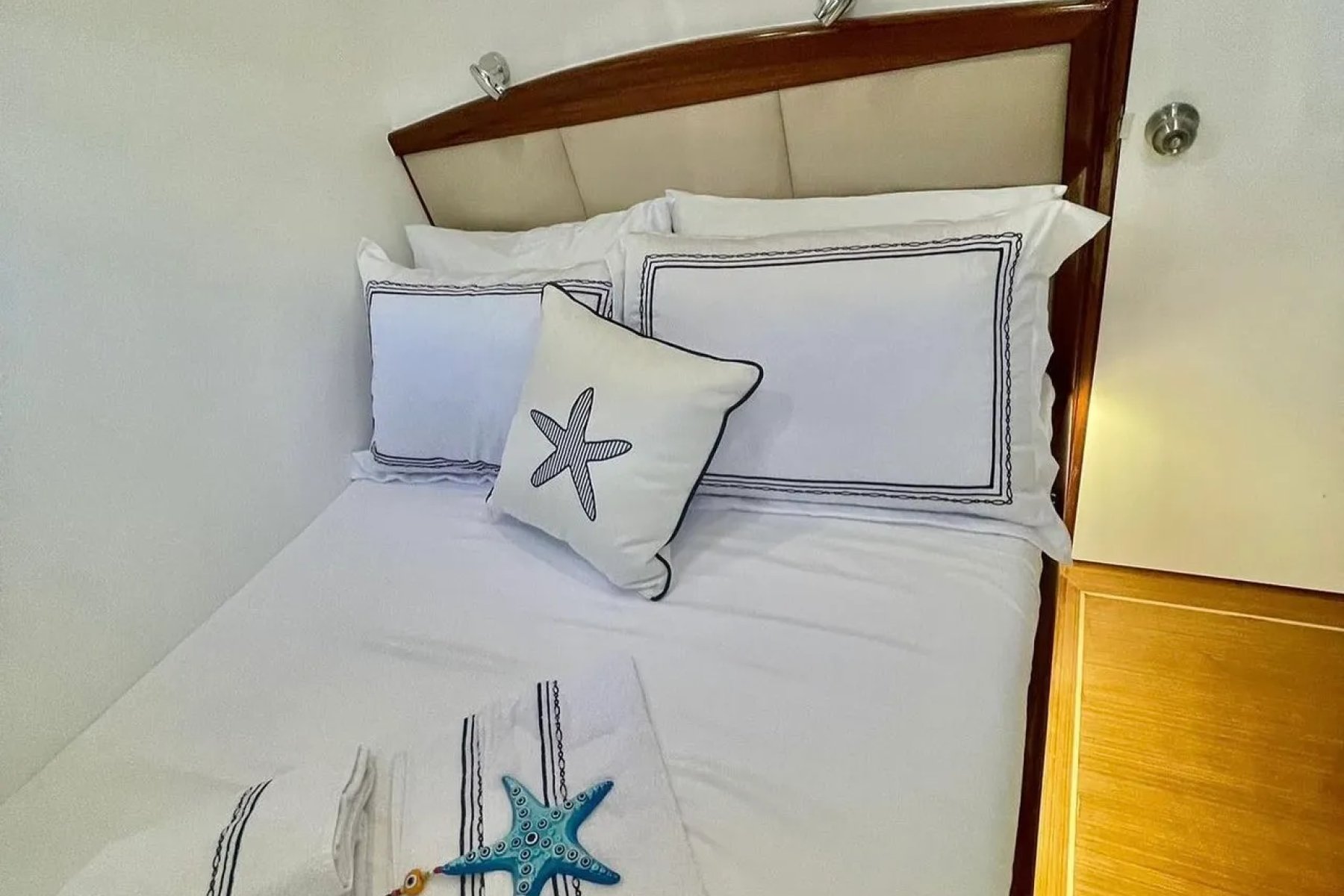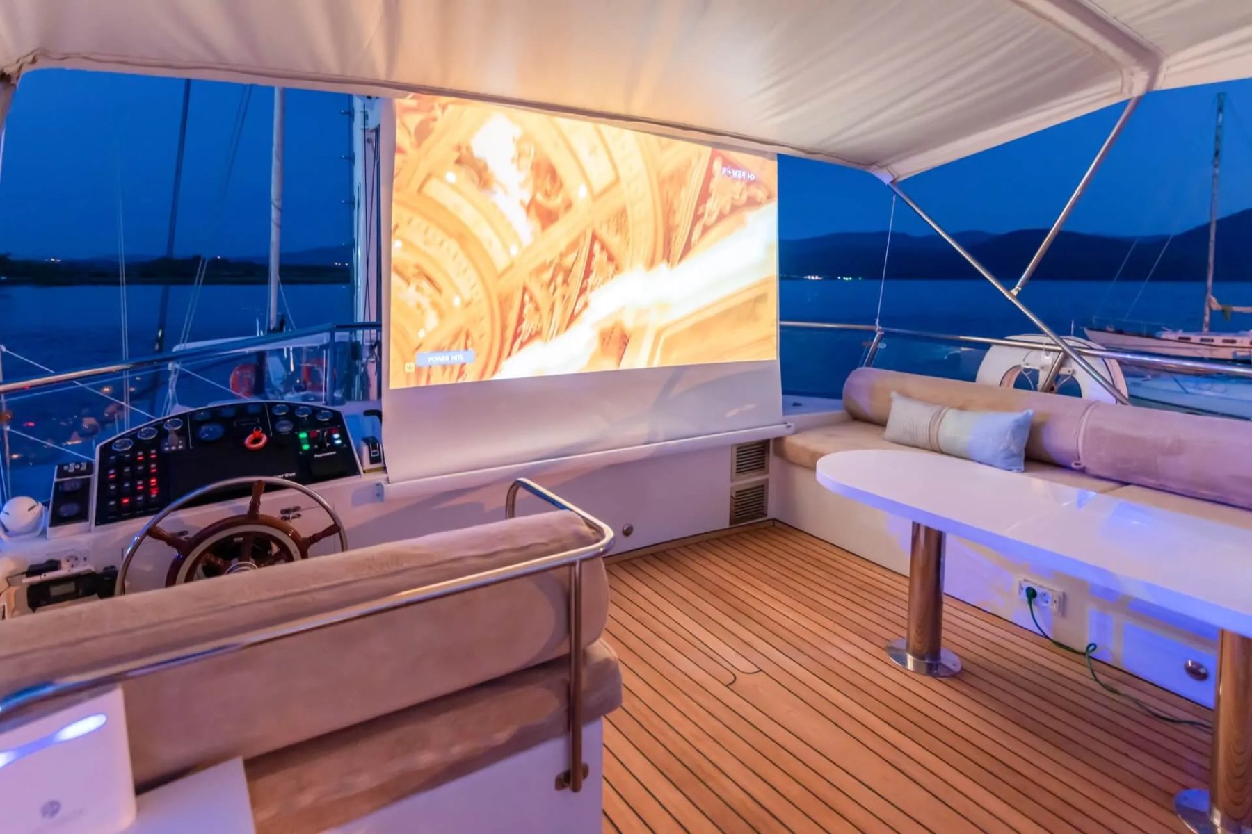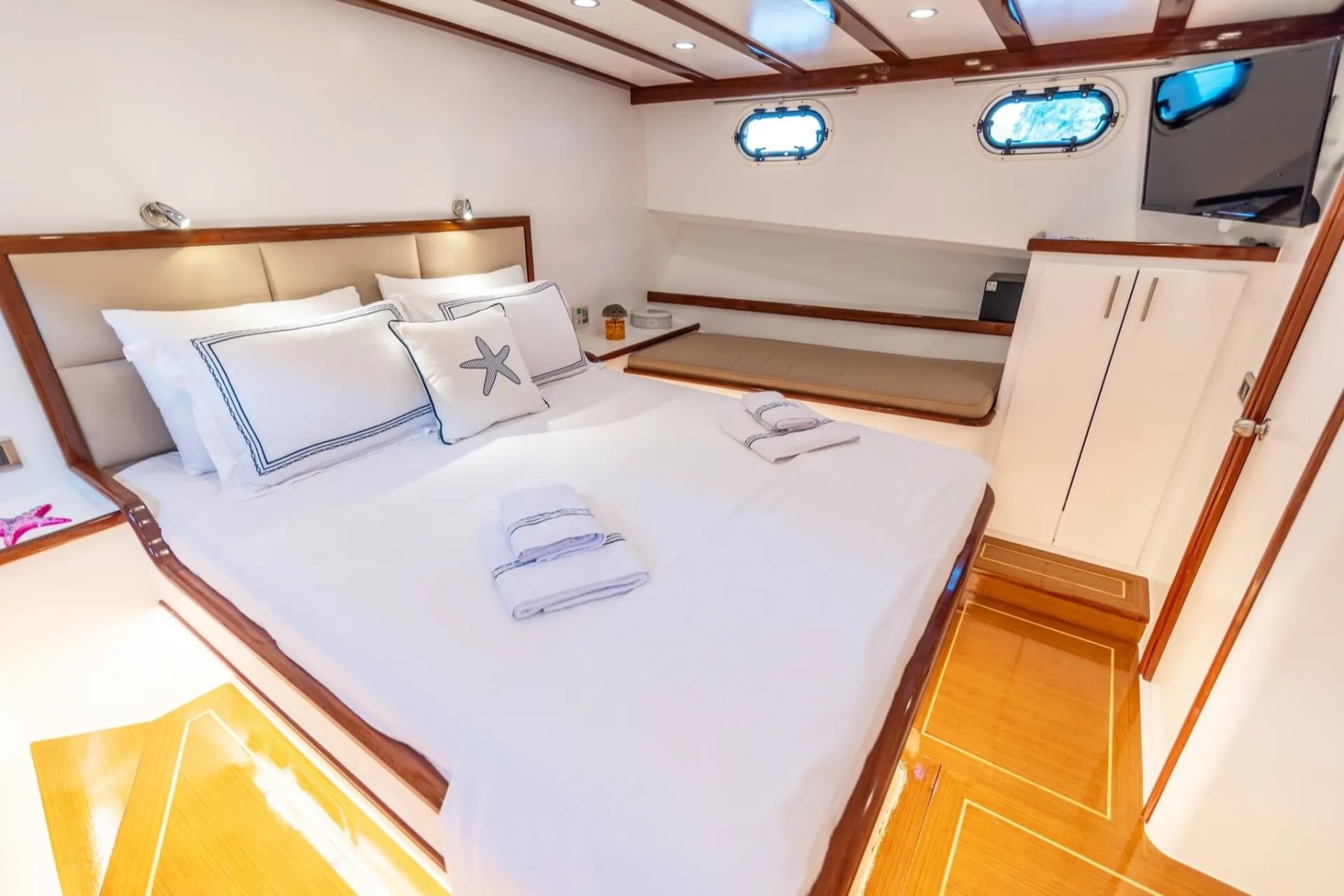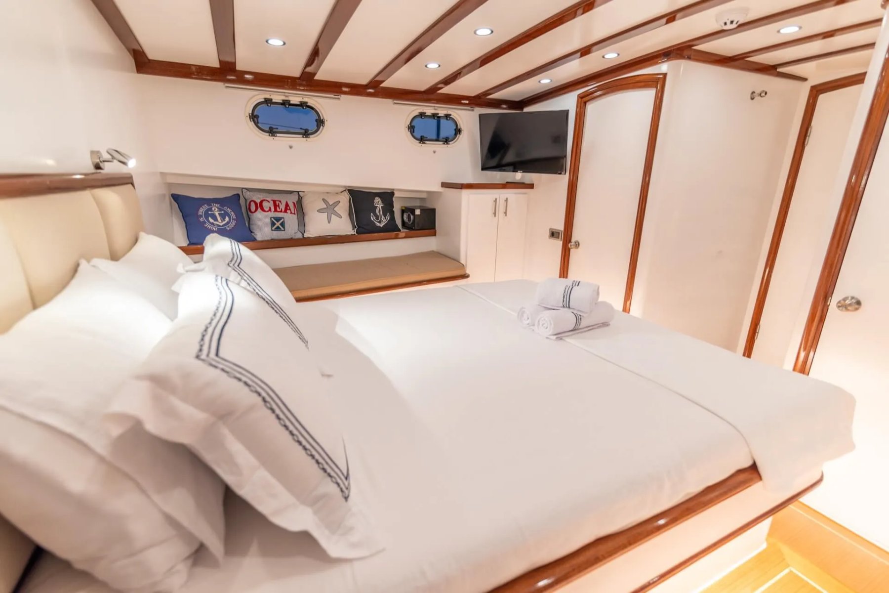 Teknemizde görevli kaptan, aşçı ve gemiciden oluşan 3 kişilik uzman ekip, tatiliniz boyunca yüksek standartlarda hizmet sunmaktadır. Geniş arka güverte, konforlu güneşlenme minderleri ve eşsiz manzaralar sunan flybridge alanı, misafirlerin gün boyu huzur bulabileceği özel noktalar olarak tasarlanmıştır. Her detay, deniz üzerinde kusursuz bir dinlenme alanı yaratmak amacıyla modernize edilmiştir.