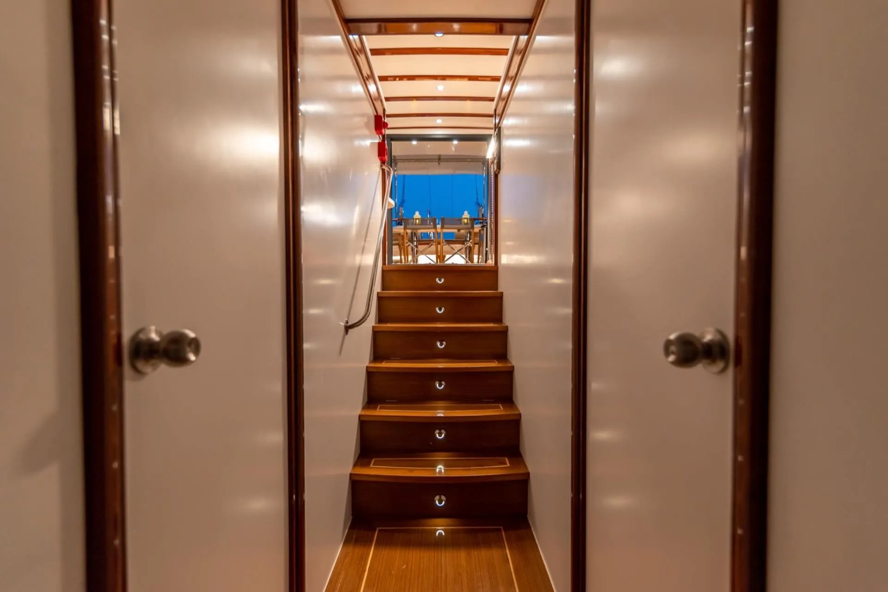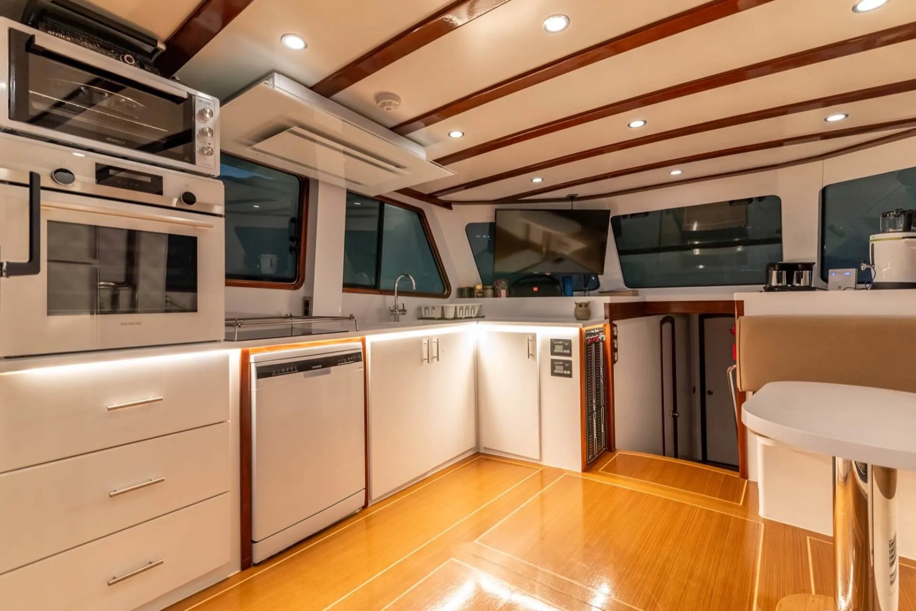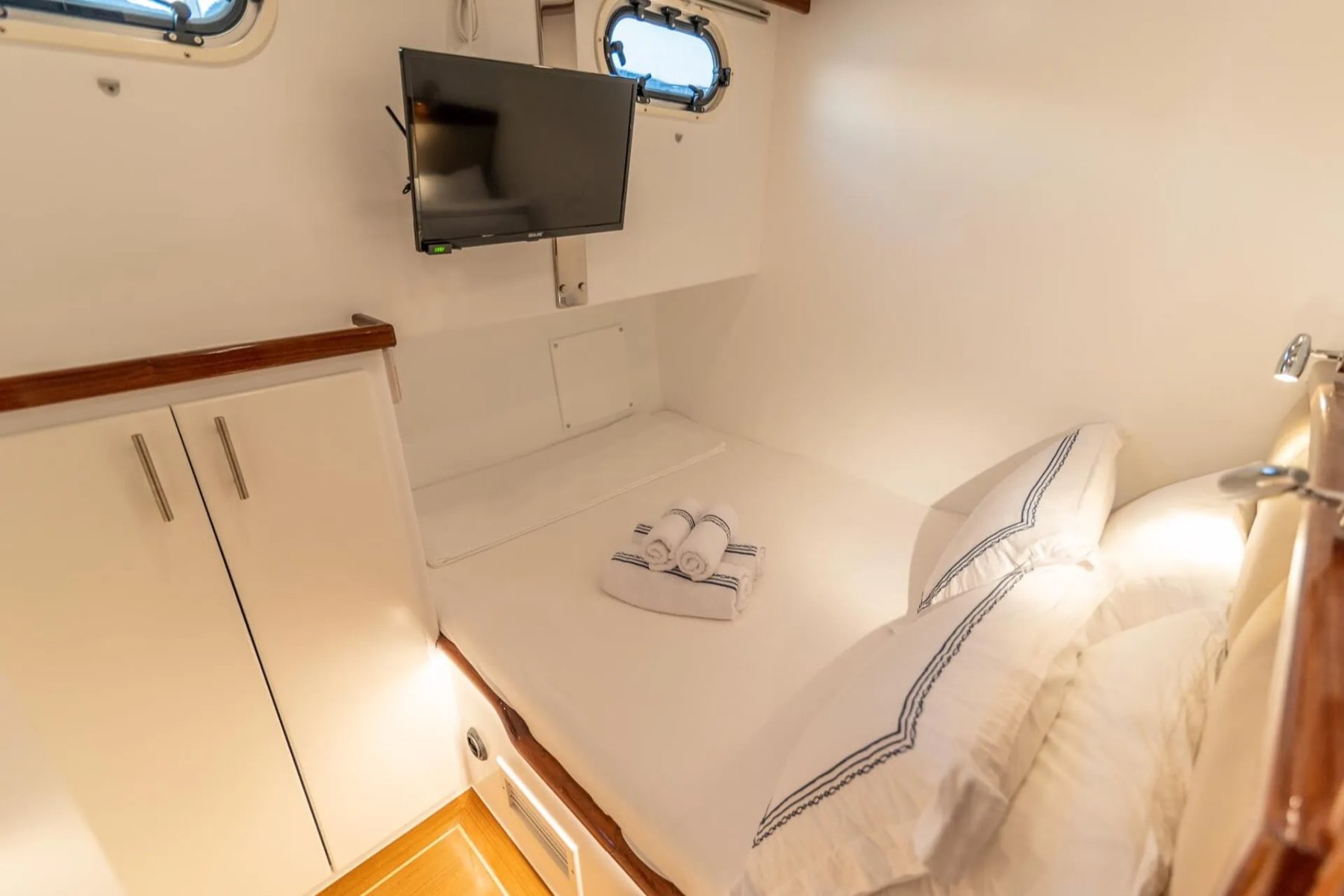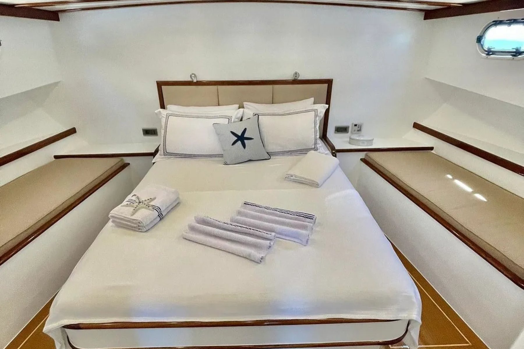 Teknemizde görevli kaptan, aşçı ve gemiciden oluşan 3 kişilik uzman ekip, tatiliniz boyunca yüksek standartlarda hizmet sunmaktadır. Geniş arka güverte, konforlu güneşlenme minderleri ve eşsiz manzaralar sunan flybridge alanı, misafirlerin gün boyu huzur bulabileceği özel noktalar olarak tasarlanmıştır. Her detay, deniz üzerinde kusursuz bir dinlenme alanı yaratmak amacıyla modernize edilmiştir.