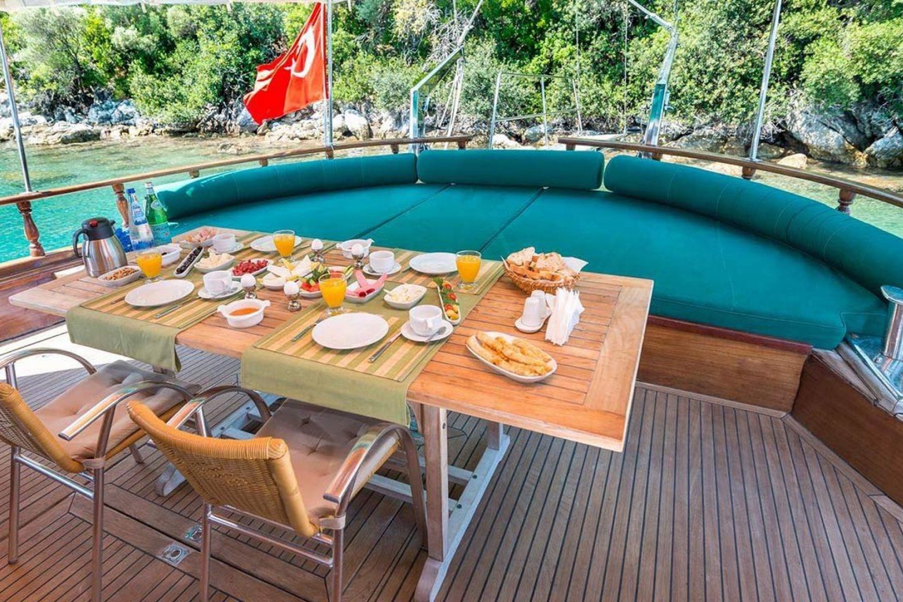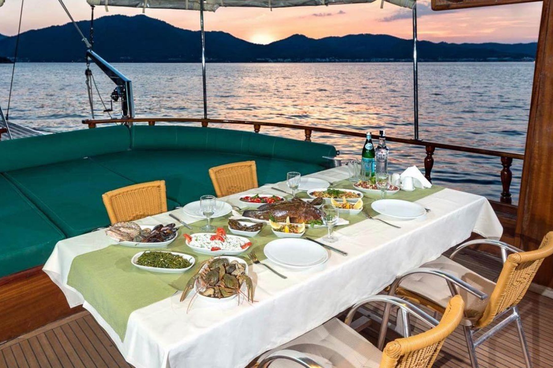 Deneyimli aşçımız dilediğiniz tüm menüleri oluşturmak, Akdeniz ve Ege'nin tüm lezzetlerini sizlere sunmak için sizlerin hizmetindedir. Tekne kiralama sürecinde dilediğiniz menüleri ve özel yemek isteklerini oluşturmak için Ofis personelimiz turunuz başlamadan önce sizlere irtibata geçecektir.
