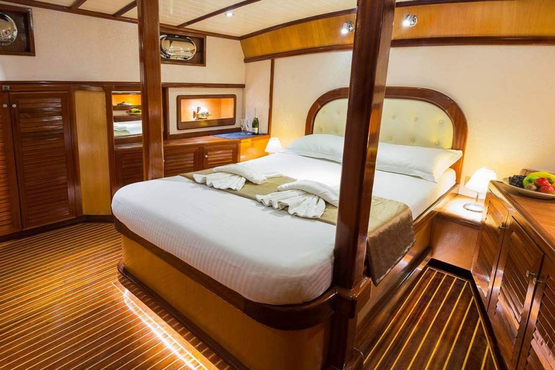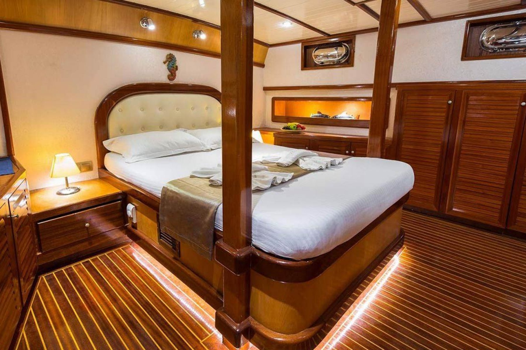 1 Master Kabin ve 2 Double Kabin olmak üzere birbirinden şık ve rahat, kendine ait duş, WC ve kliması olan Marmaris 6 kişilik gulet toplamda 3 kabine sahiptir.