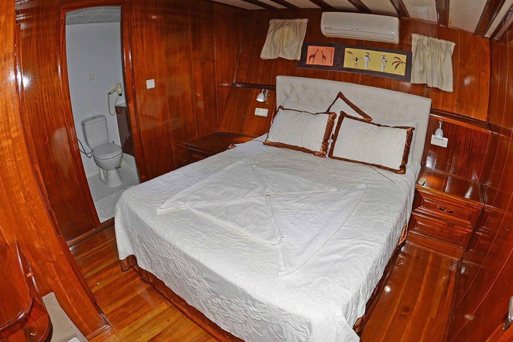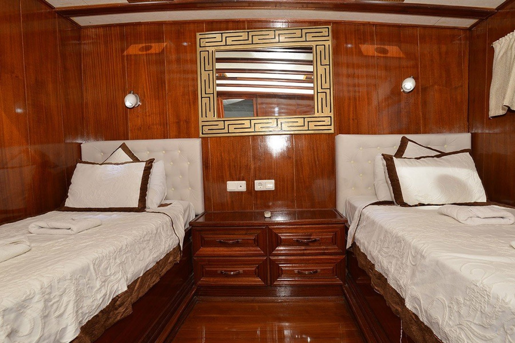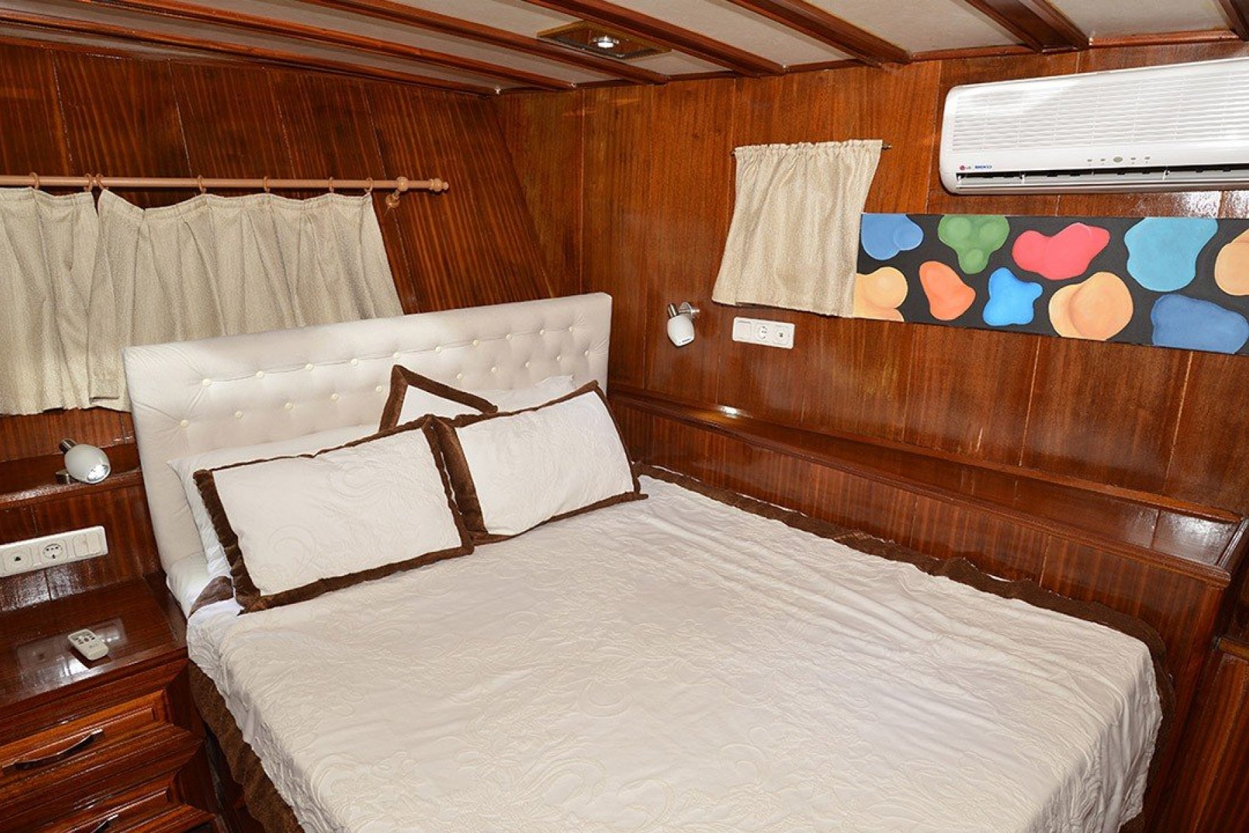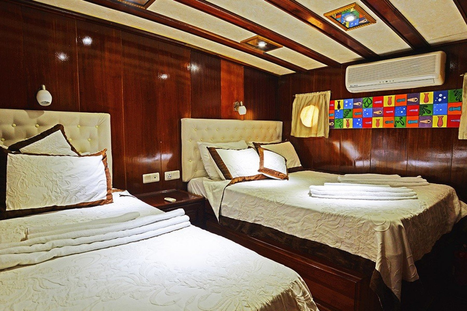 Bu yatımızda, kaliteli yaşam alanları ve geniş tasarımı ile 6 double, 2 twin, 2 triple, olmak üzere toplam 10 Klimalı kabin bulunmaktadır. Bunun yanı sıra teknemizde mürettebat için ayrı yaşam alanları, tam teşekküllü mutfak, açık ve kapalı yemek servisi yapılabilen alanlar bulunmaktadır.