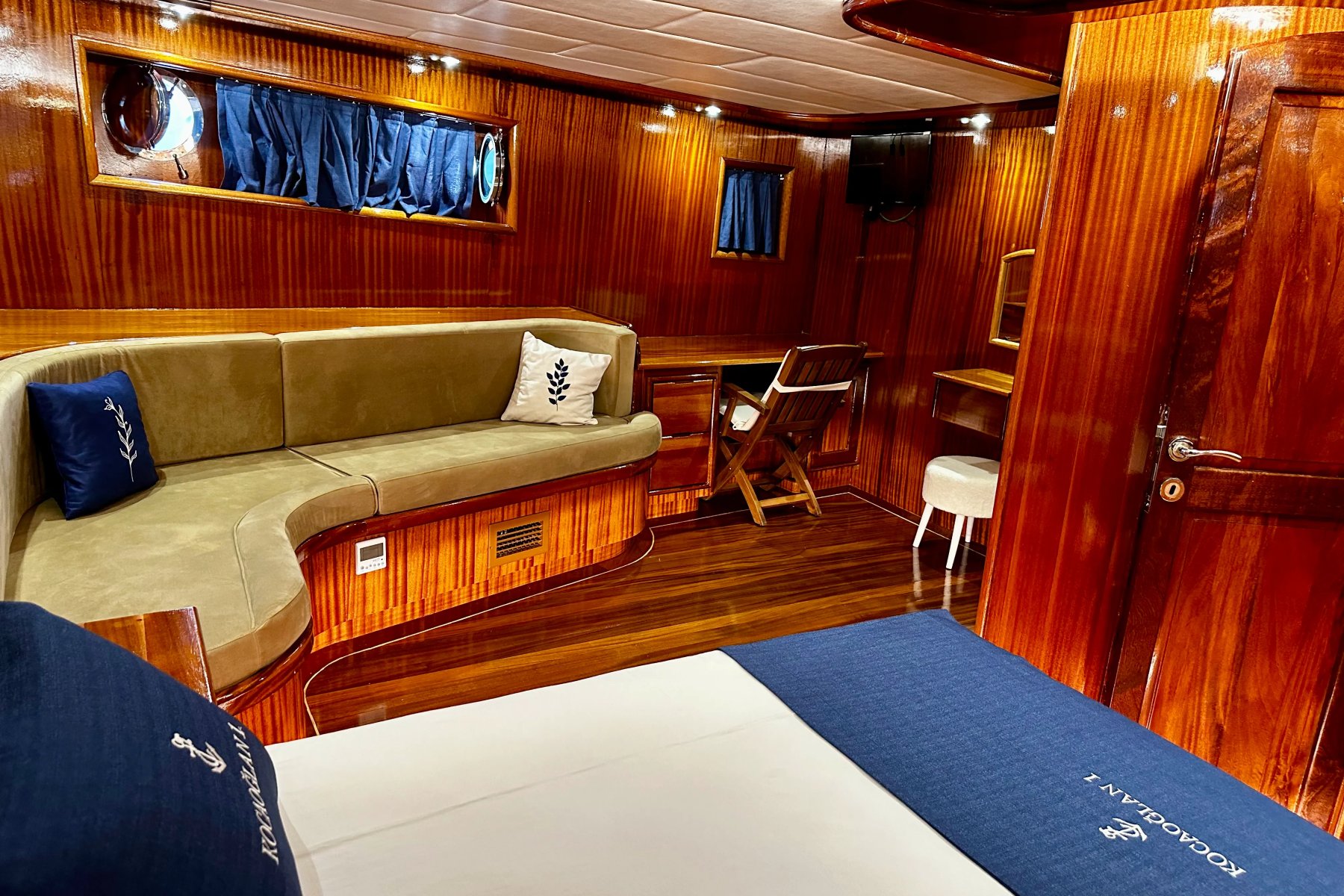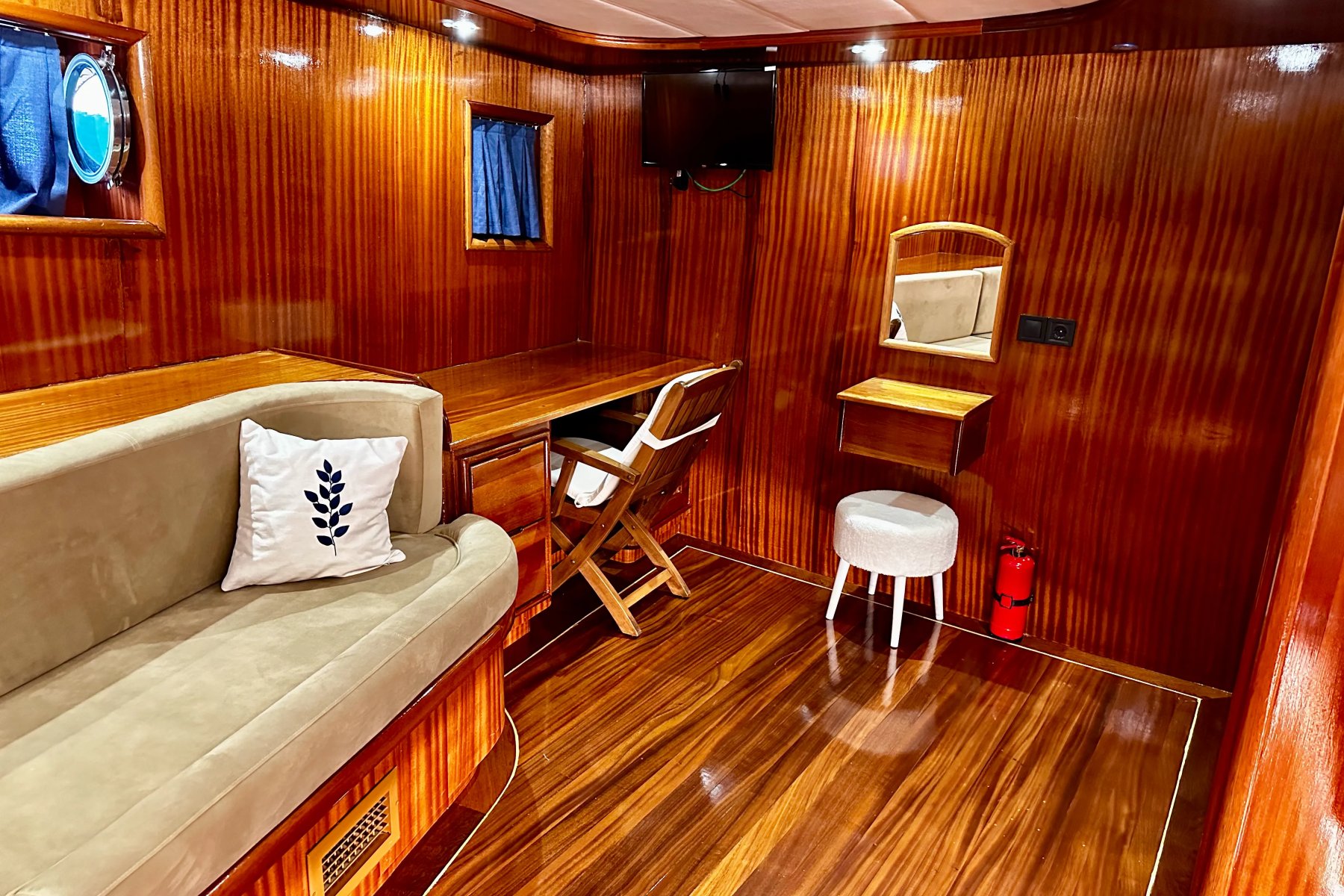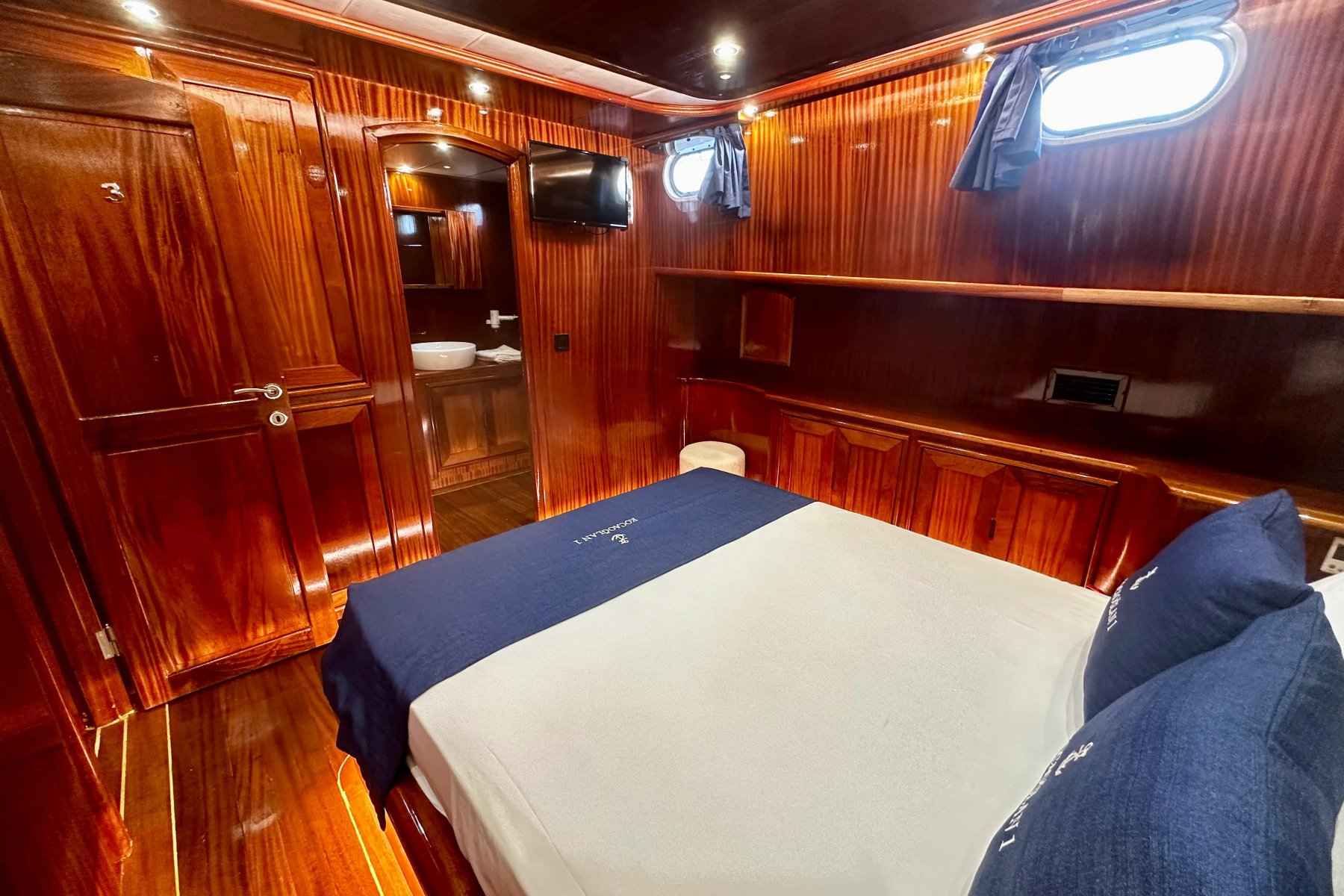 Her kabin, konforu ön planda tutan modern detaylarla donatılmıştır. Duşakabinli banyo, özel WC ve 24 saat hizmet veren klima sistemi ile misafirler kendilerini özel hisseder. İç mekanlar ferah, aydınlık ve deniz manzarasının keyfini çıkaracak şekilde tasarlanmıştır.Turunuz boyunca kendinizi sadece doğaya ve huzurlu bir tatile bırakabileceğiniz, rahatlayabileceğiniz bir donanım seviyesi gözetilerek inşa edilen teknemizde tek düşünmeniz gereken hiçbir şey düşünmemek !