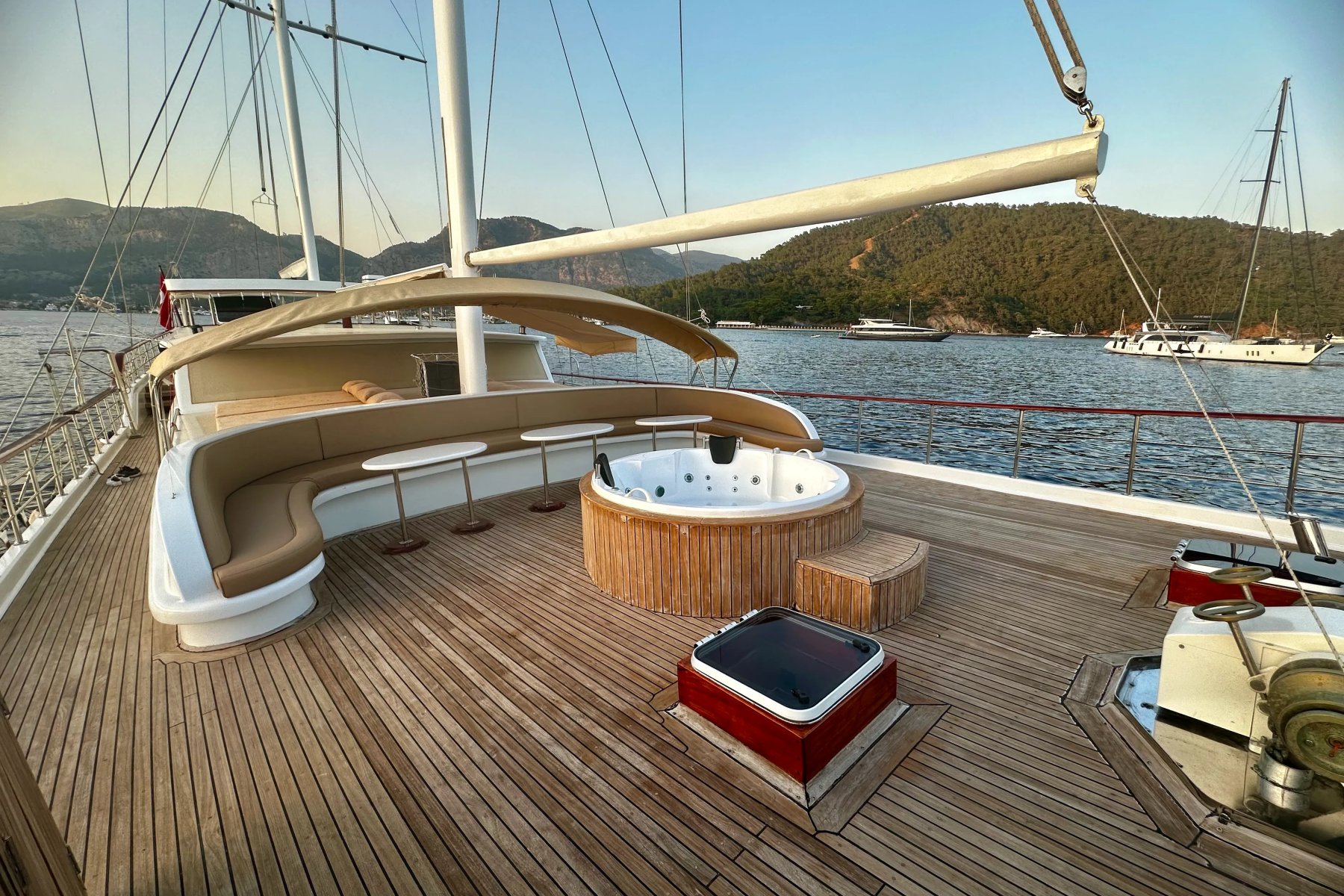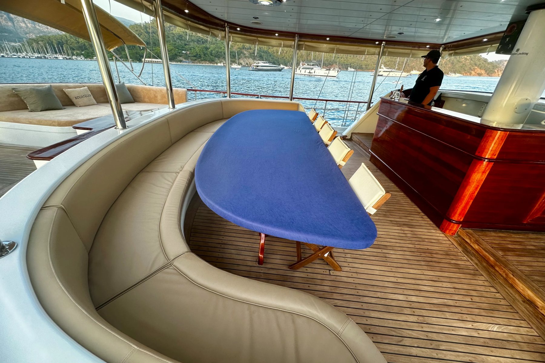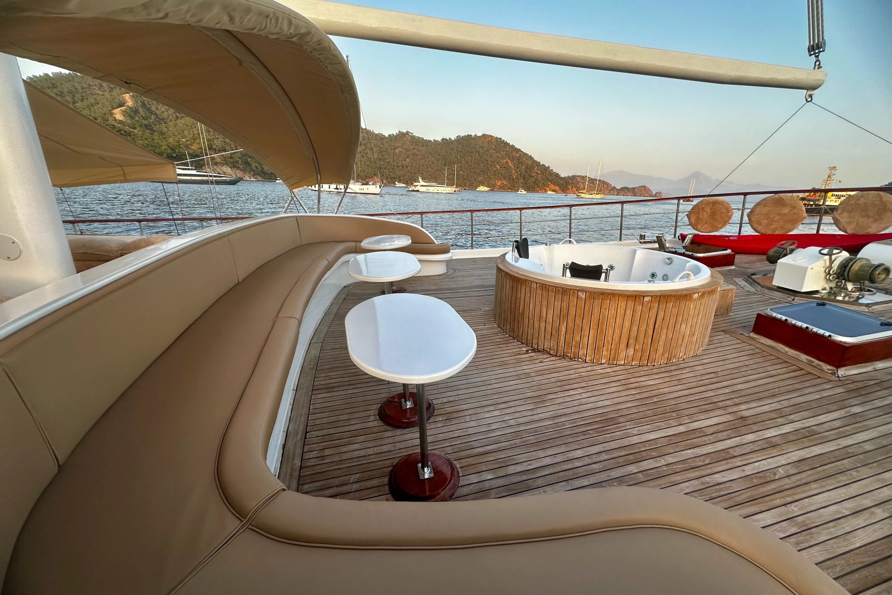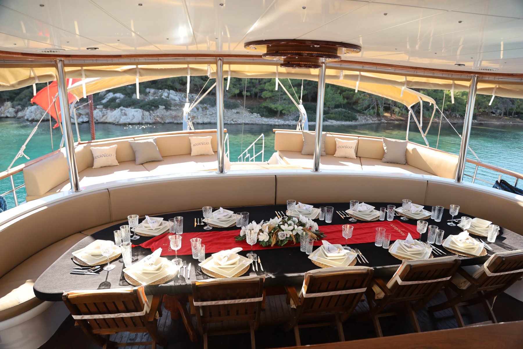 Kocaoğlan 1’de tam donanımlı ayrı bir mutfak, açık ve kapalı yemek alanları, klimalı salon, arka güvertede geniş bir yemek masası ve konforlu oturma grubu yer alır. Ön güvertede ise güneşlenme minderleri, oturma alanı, masa ve deniz keyfinizi taçlandıran bir jakuzi bulunur.