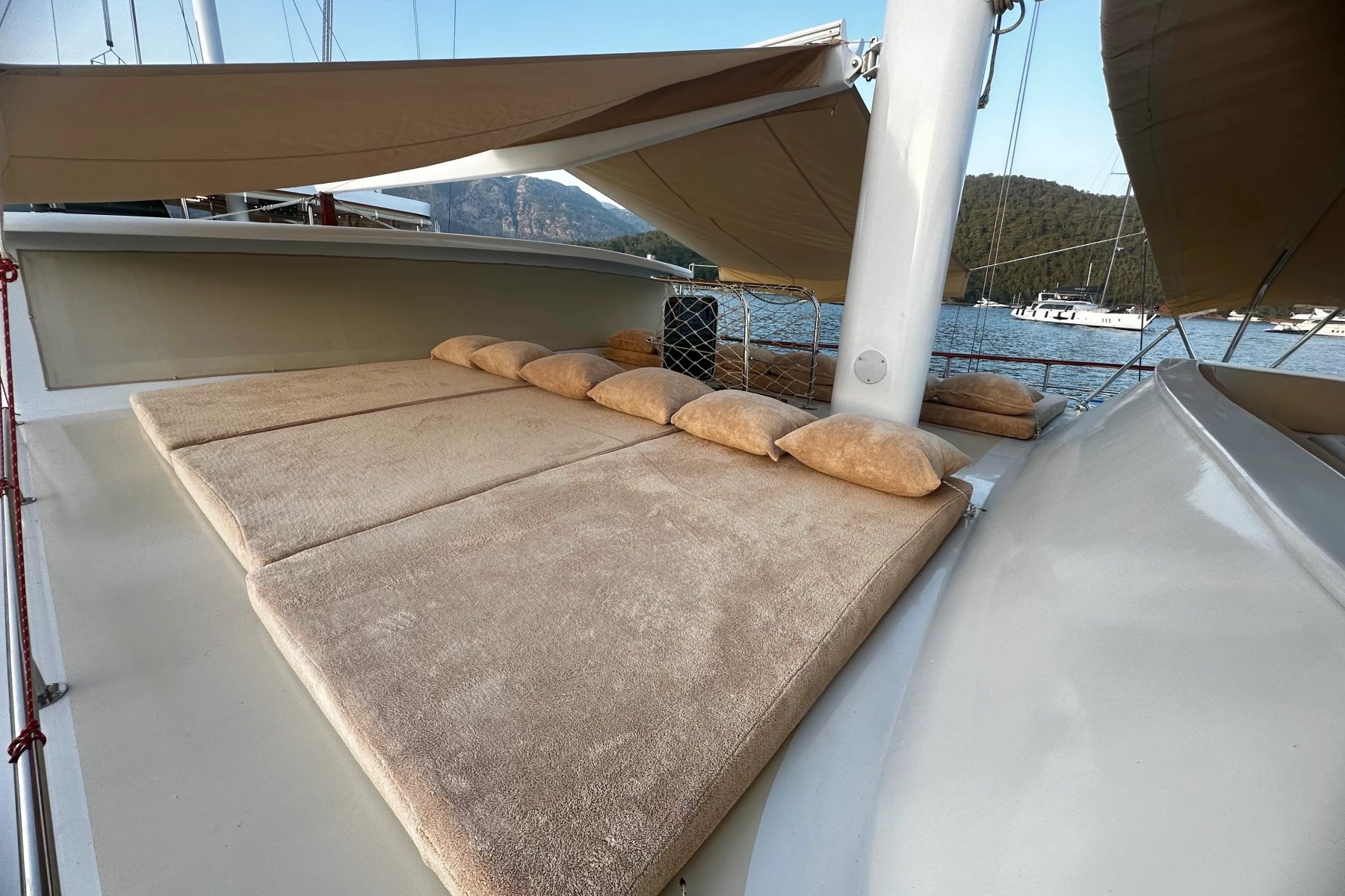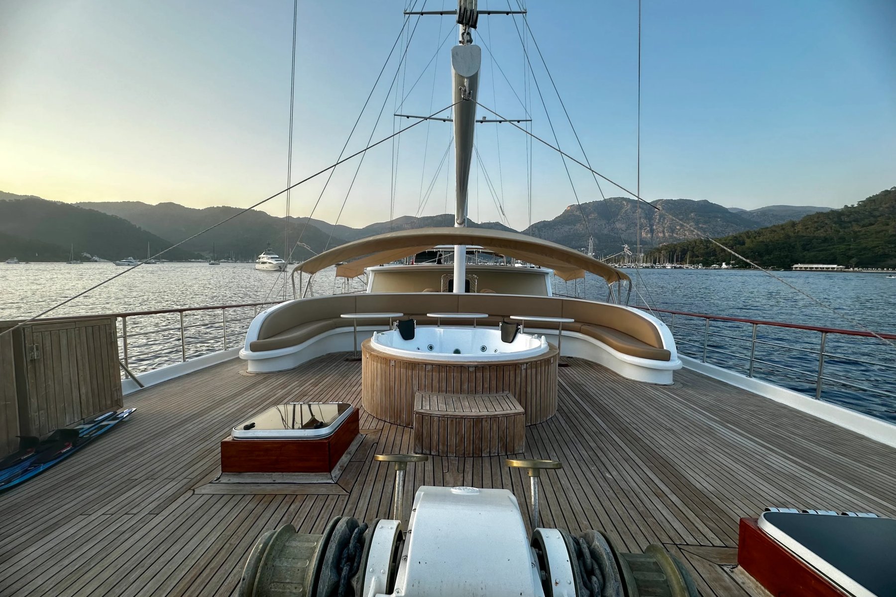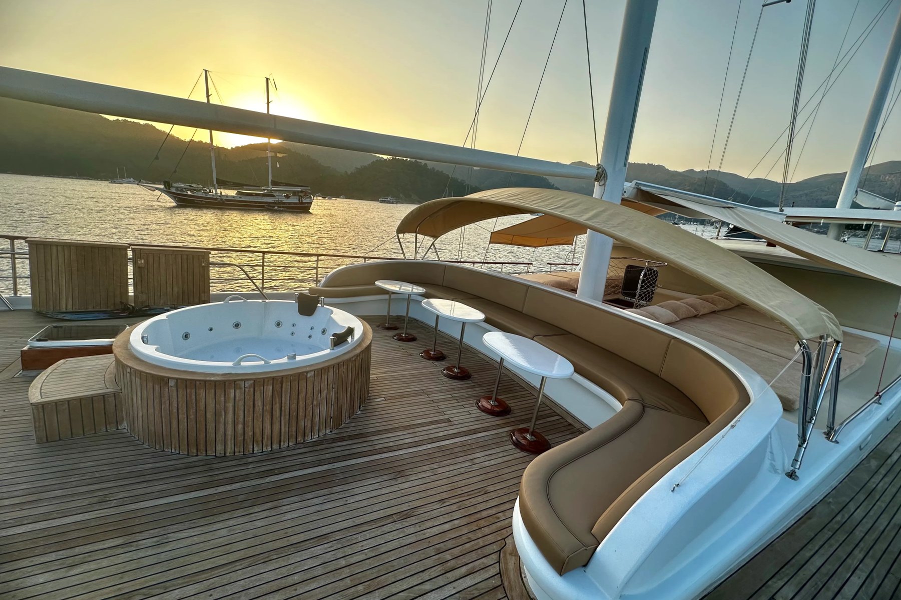 Kocaoğlan 1’de tam donanımlı ayrı bir mutfak, açık ve kapalı yemek alanları, klimalı salon, arka güvertede geniş bir yemek masası ve konforlu oturma grubu yer alır. Ön güvertede ise güneşlenme minderleri, oturma alanı, masa ve deniz keyfinizi taçlandıran bir jakuzi bulunur.