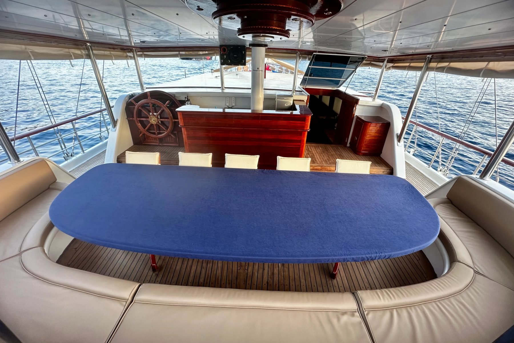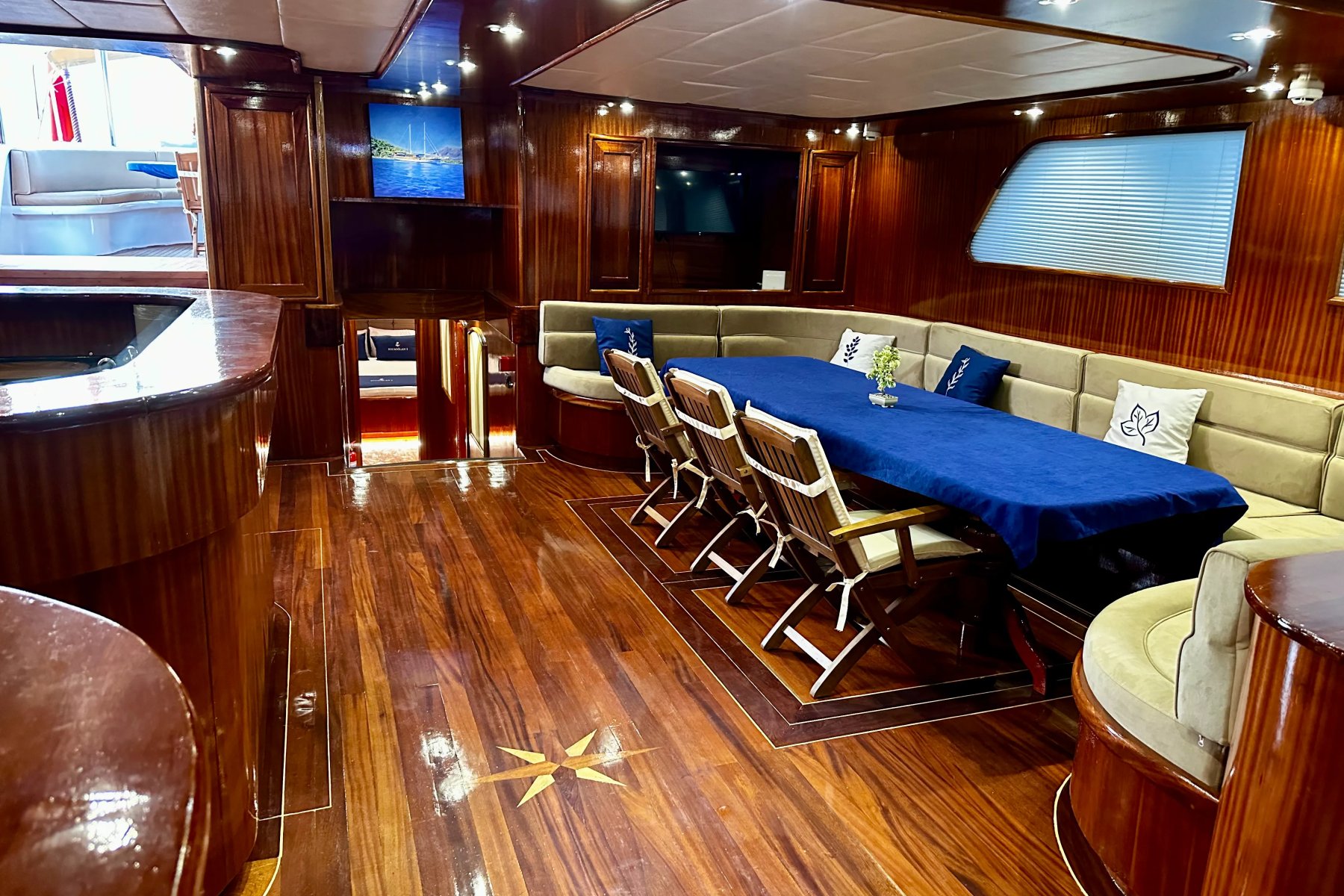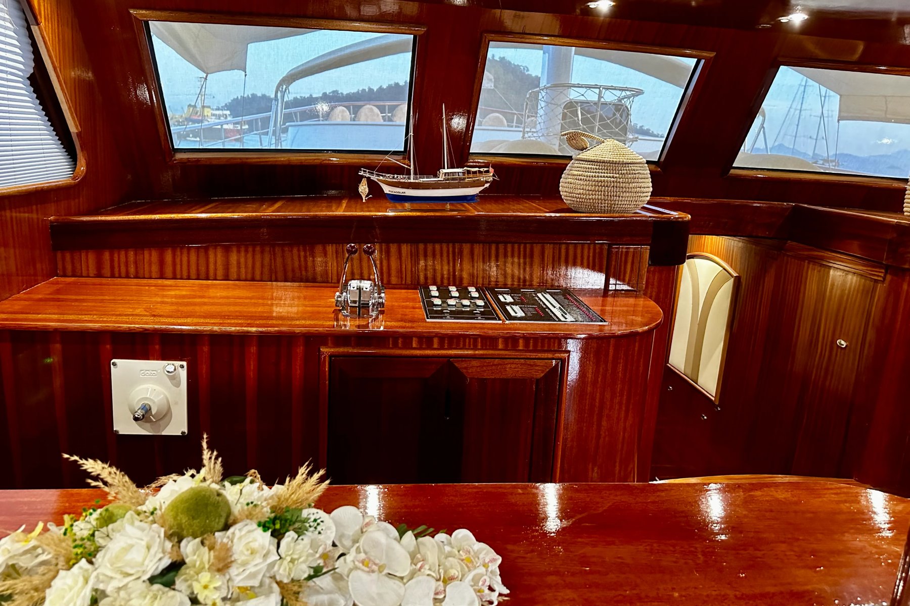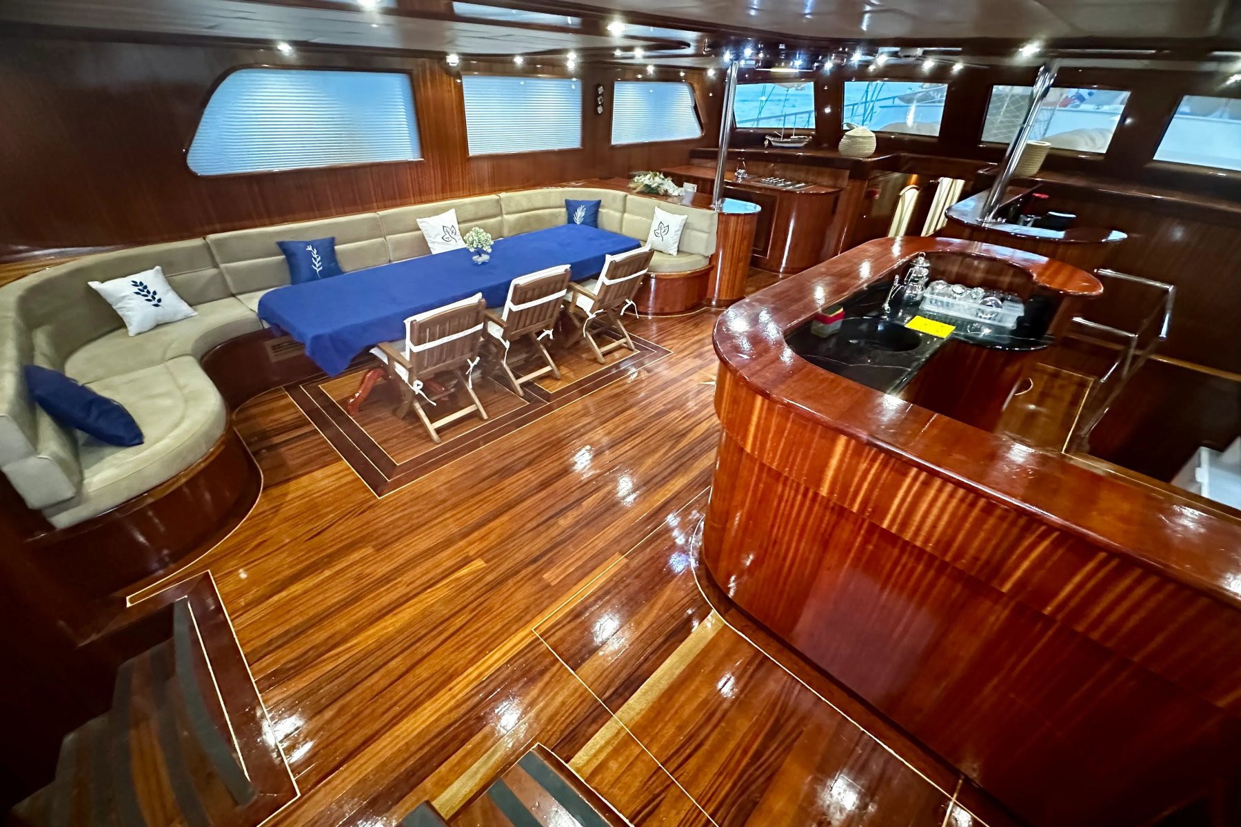 Kocaoğlan 1’de tam donanımlı ayrı bir mutfak, açık ve kapalı yemek alanları, klimalı salon, arka güvertede geniş bir yemek masası ve konforlu oturma grubu yer alır. Ön güvertede ise güneşlenme minderleri, oturma alanı, masa ve deniz keyfinizi taçlandıran bir jakuzi bulunur.