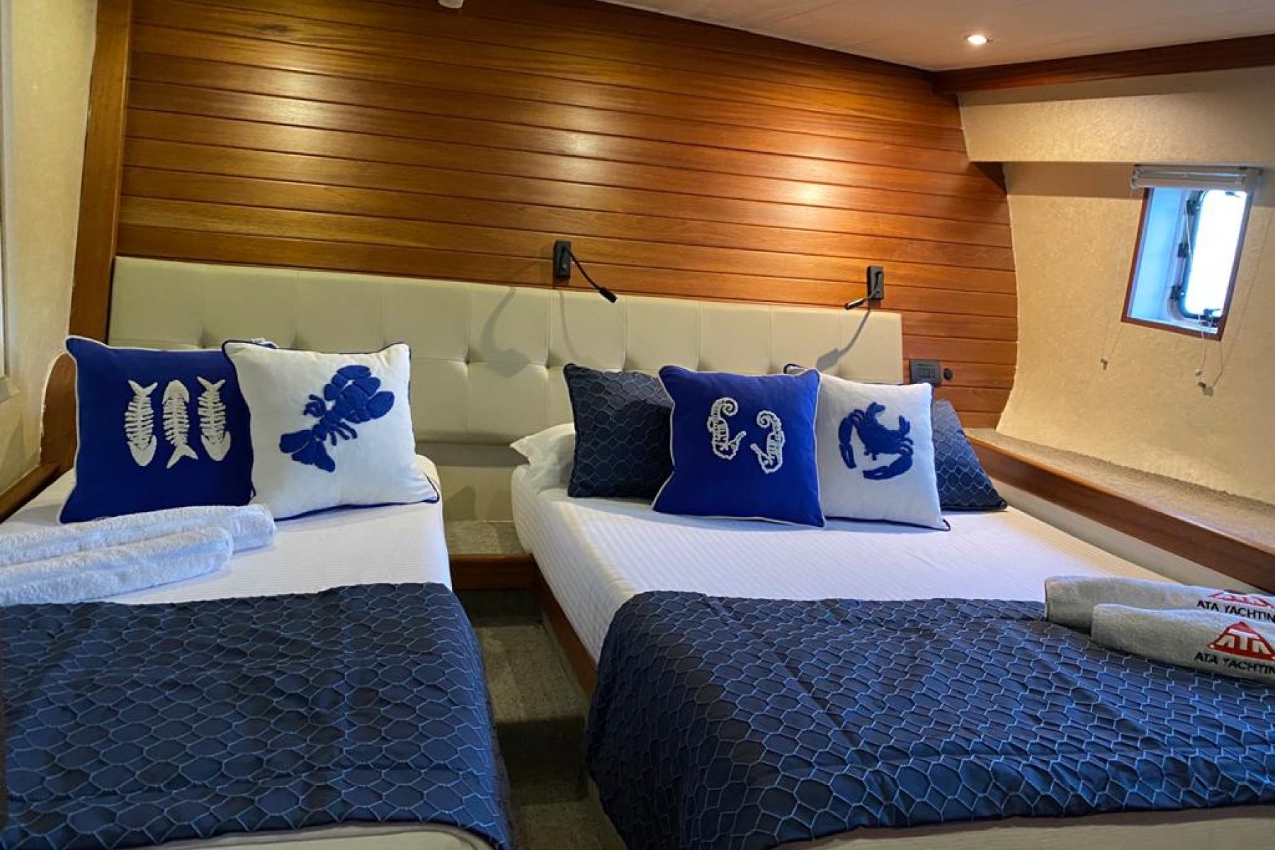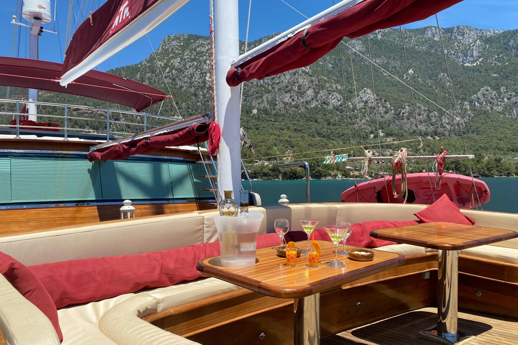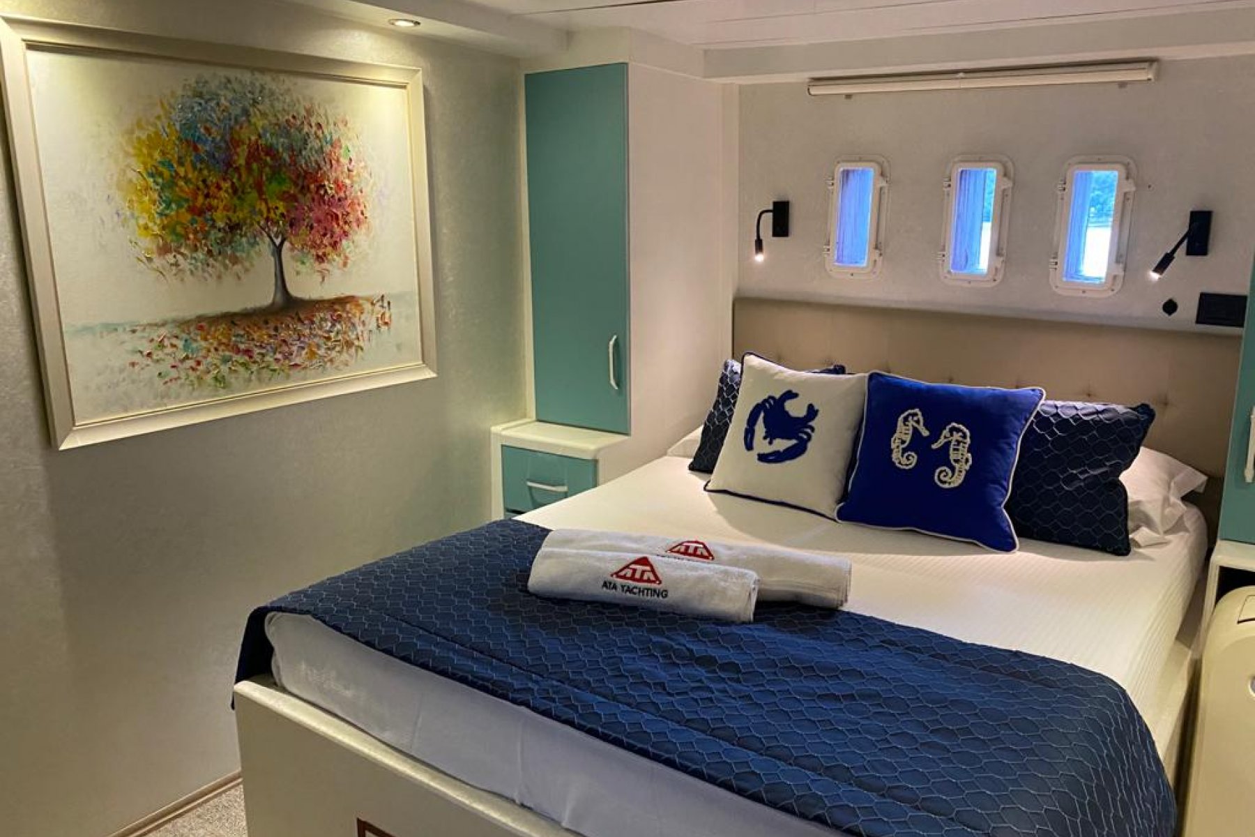 bu lüks guletimiz 24 saat klimalı kapalı alanları, rüzgar sörfü, pedal board, su bisikleti, ringo, banana gibi su oyuncakları ile mavi yolculuk turunuzu bir üst seviyeye taşıyacaktır. Kiralık yat Göcek kelimesinin tam karşılığı bu guletimiz bir hafta boyunca sizlerin hizmetinde olacak 4 kişilik mürettebata sahiptir.