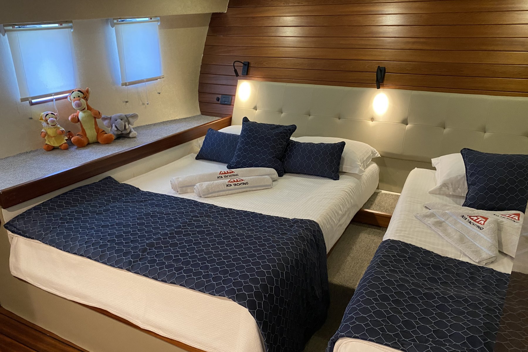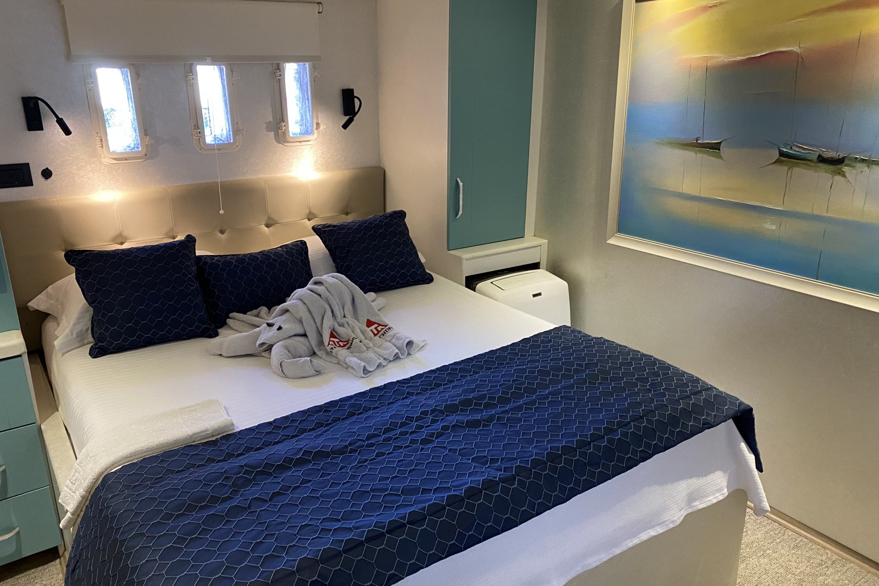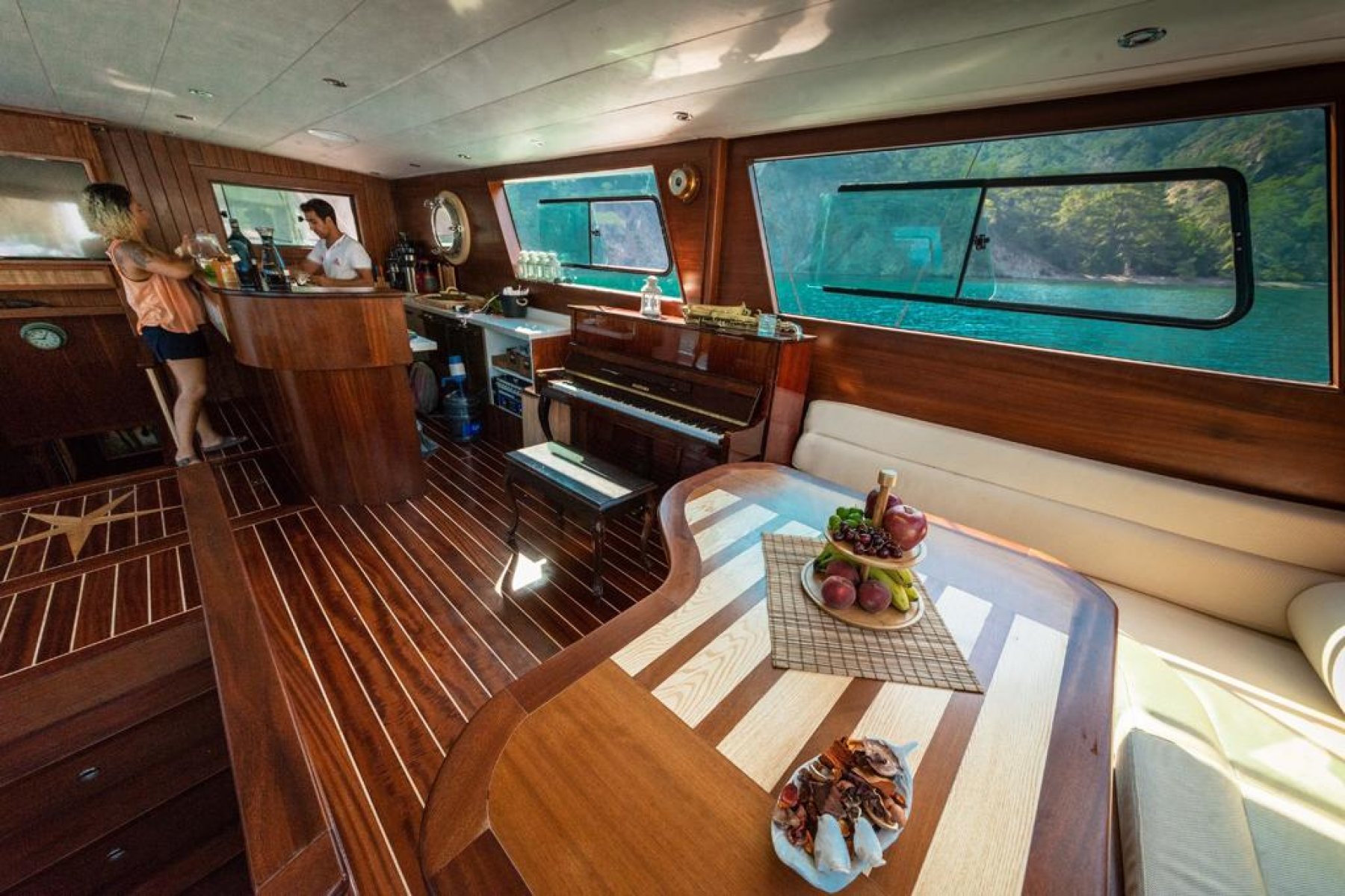 bu lüks guletimiz 24 saat klimalı kapalı alanları, rüzgar sörfü, pedal board, su bisikleti, ringo, banana gibi su oyuncakları ile mavi yolculuk turunuzu bir üst seviyeye taşıyacaktır. Kiralık yat Göcek kelimesinin tam karşılığı bu guletimiz bir hafta boyunca sizlerin hizmetinde olacak 4 kişilik mürettebata sahiptir.