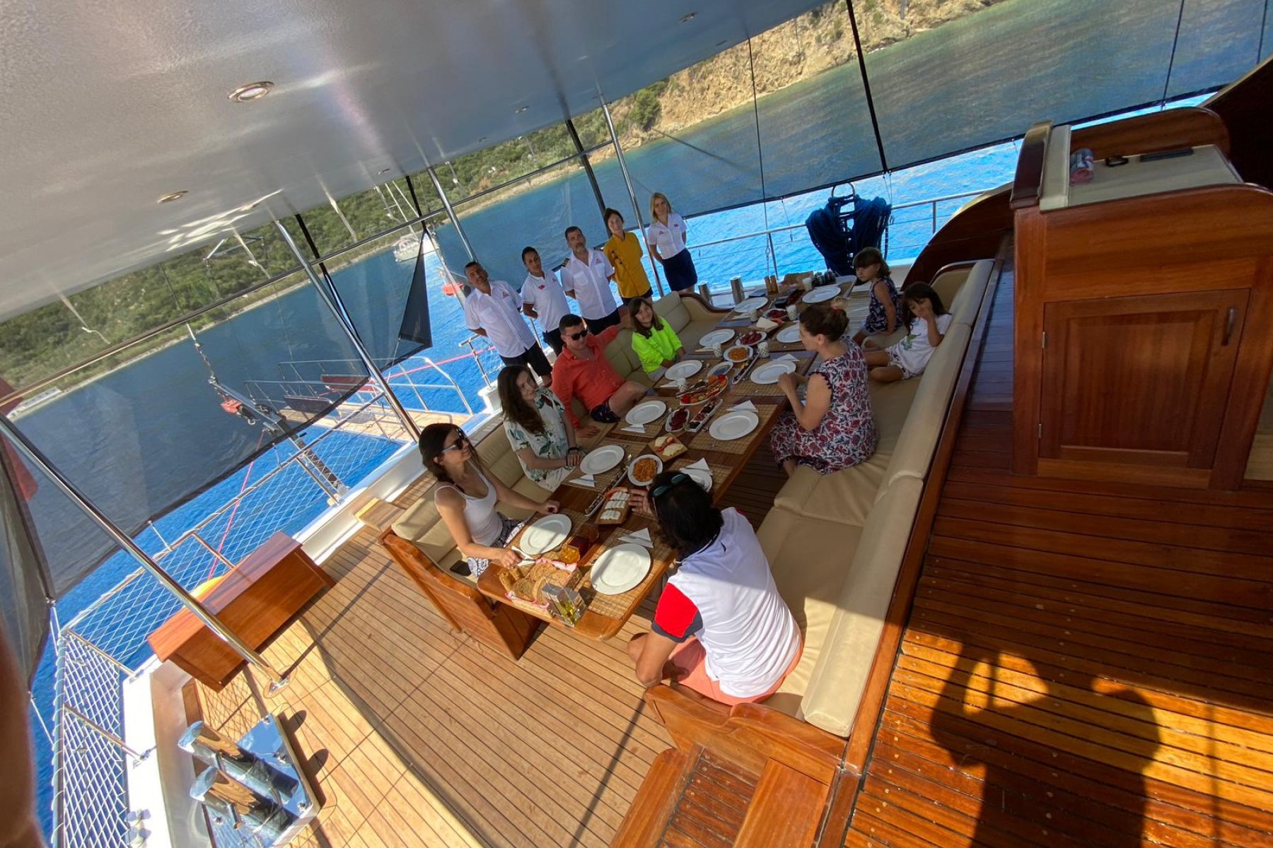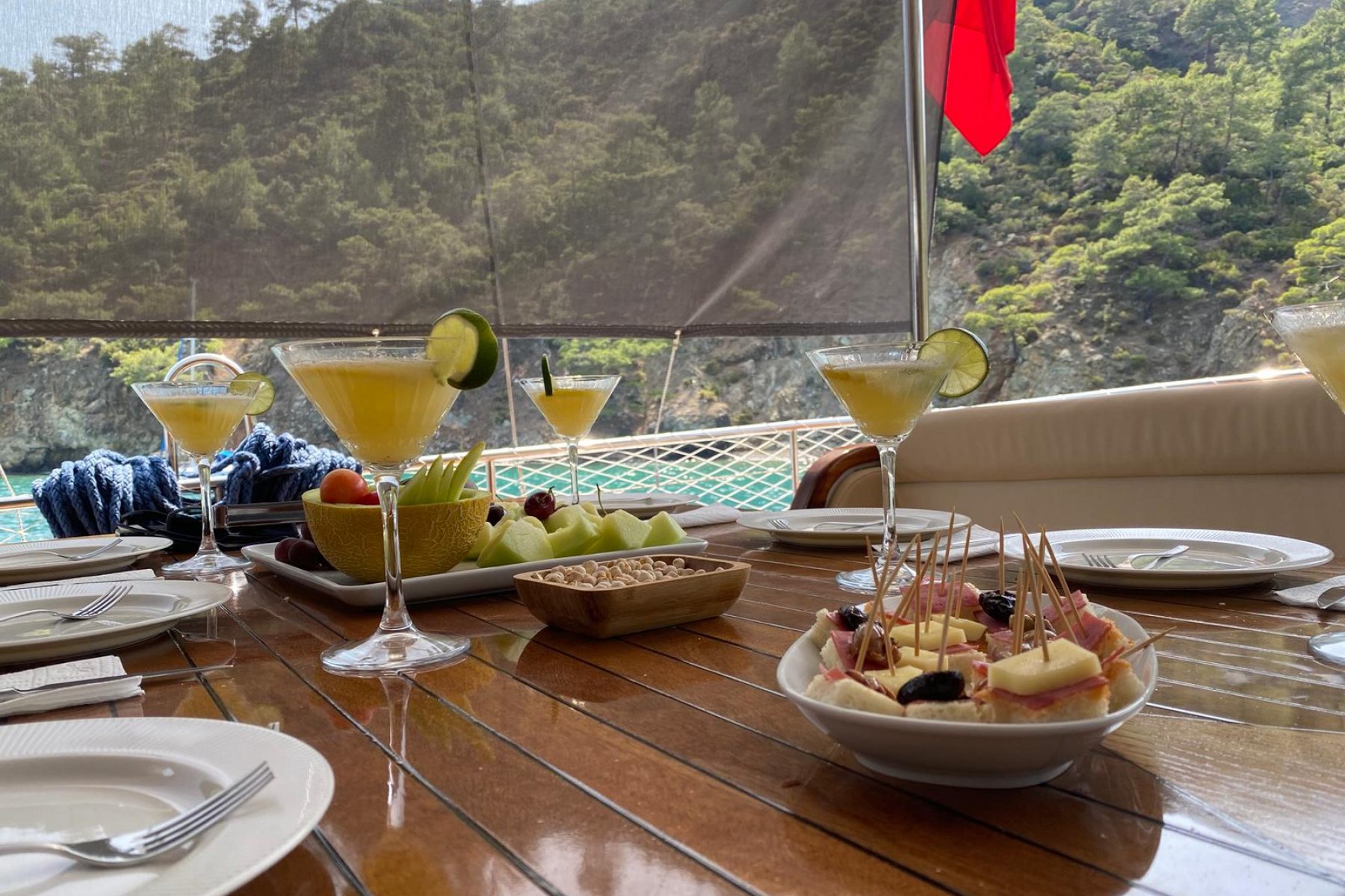 Deneyimli aşçımız dilediğiniz tüm menüleri oluşturmak, Akdeniz ve Ege'nin tüm lezzetlerini sizlere sunmak için sizlerin hizmetindedir. Tekne kiralama sürecinde dilediğiniz menüleri ve özel yemek isteklerini oluşturmak için Ofis personelimiz turunuz başlamadan önce sizlere irtibata geçecektir.