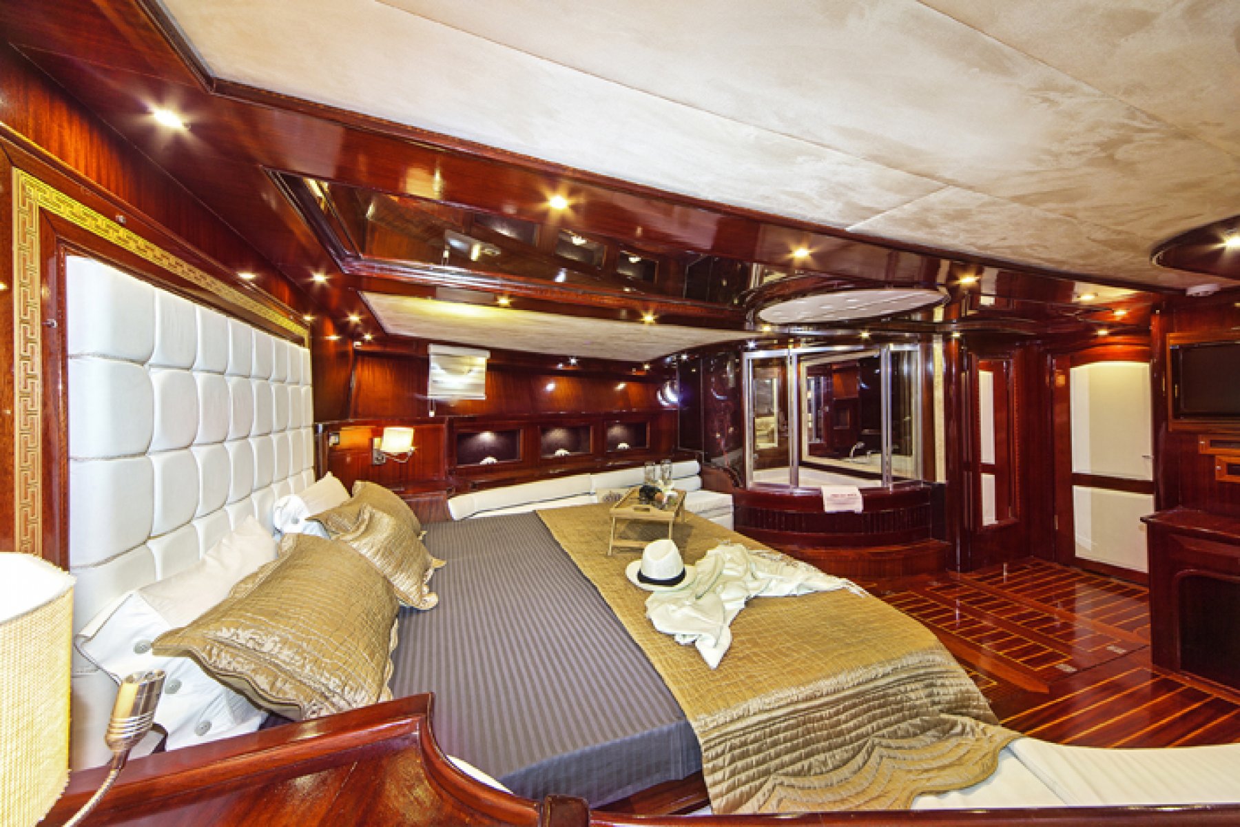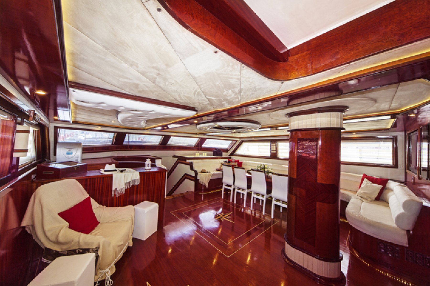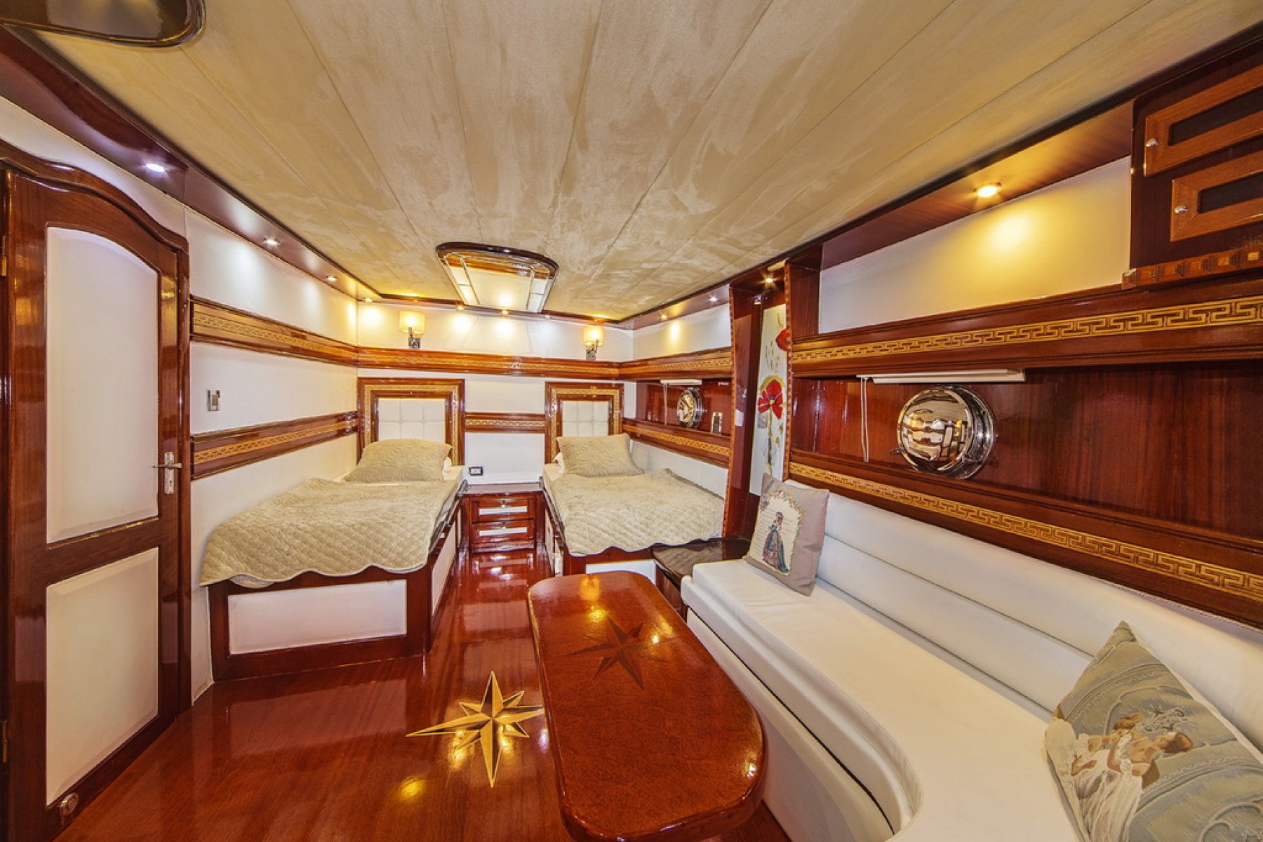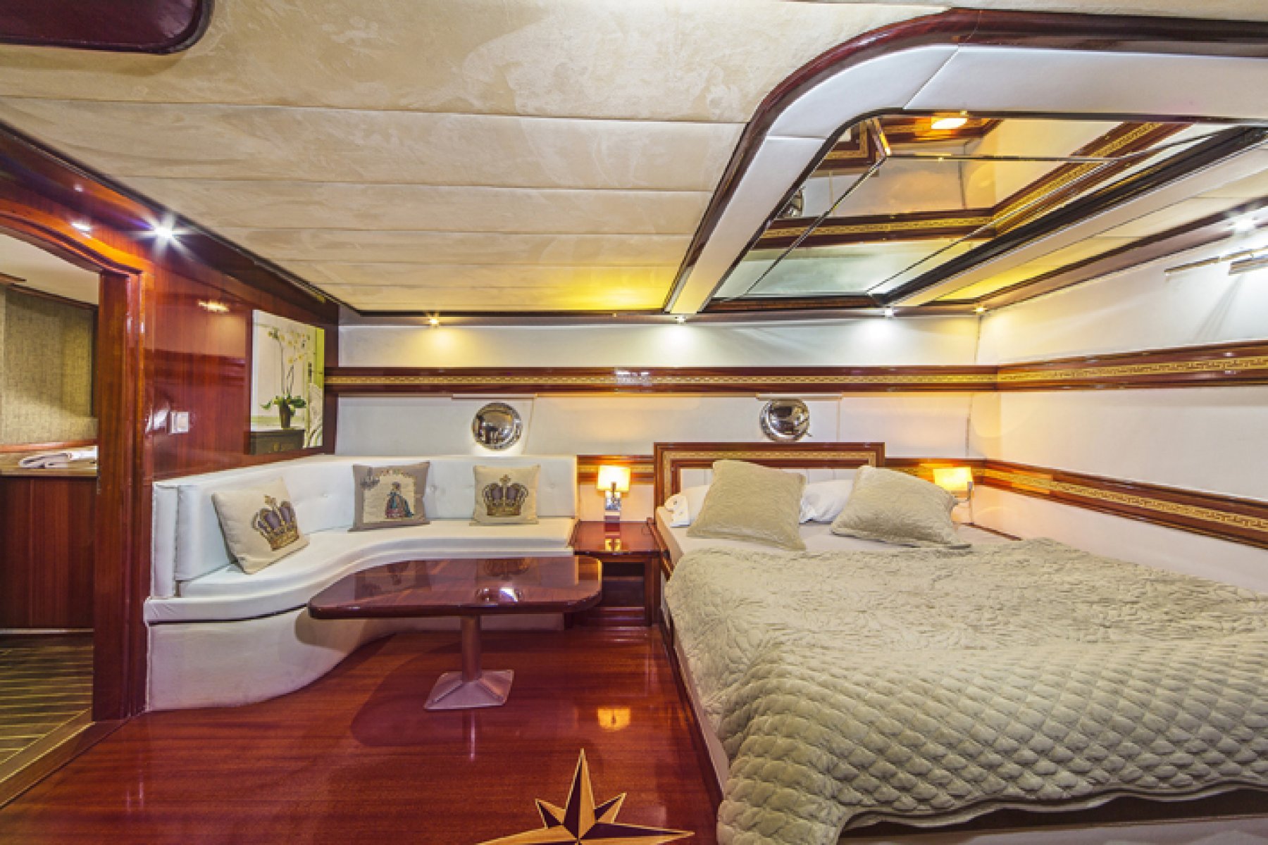 1 master, 1 Vip, 2 double ve 2 Twin yataklı kabini ile toplamda 6 klimalı kabine sahip olan bu çok özel yatımız Mavi yolculuk tatilinizi en üst seviyelere çıkarmayı hedefliyor. 36 metre uzunluğa ve 8 metre ene sahip bu oldukça geniş ve ferah lüks yatımız tüm yaz sezonu boyunca Göcek, Fethiye, Marmaris, Hisarönü ve Bodrum çıkışlı Mavi tur hizmeti vermektedir.