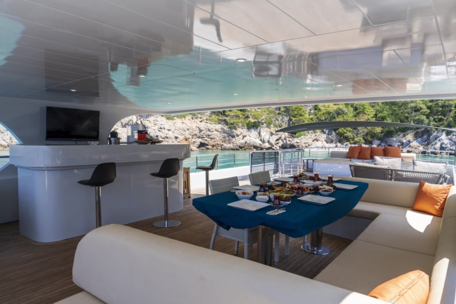 Sabahları arka güvertede kahvaltı yaparken Fethiye’nin turkuaz koyları manzaranız olur. Gün boyu ön güvertede güneşlenebilir, flybridge’te serin bir içecekle manzarayı izleyebilir ya da denize atlayarak paddle board, ringo veya şnorkel ile eğlenceli anlar yaşayabilirsiniz.
